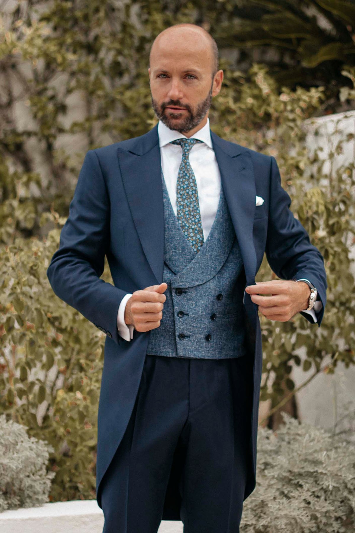 Chaqué azul marino 3 piezas en lana 100% (levita, chaleco y pantalón) por valor de 895,95€.