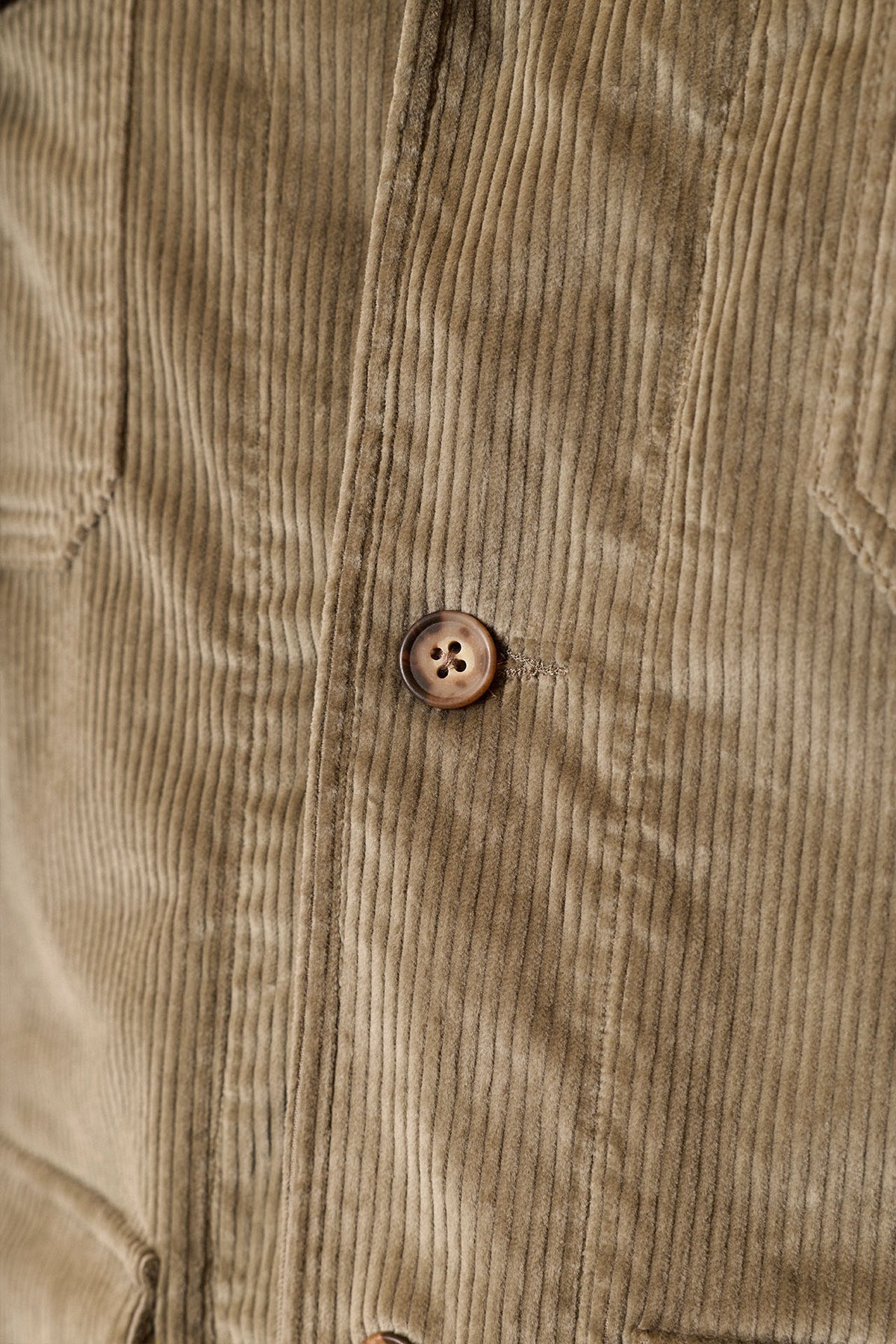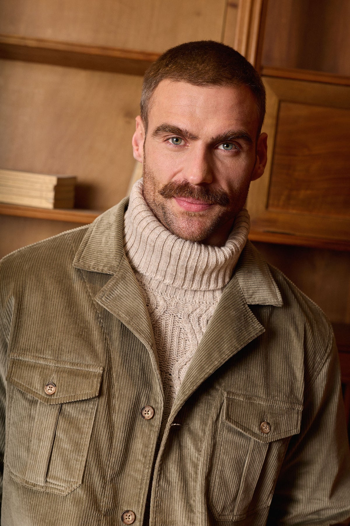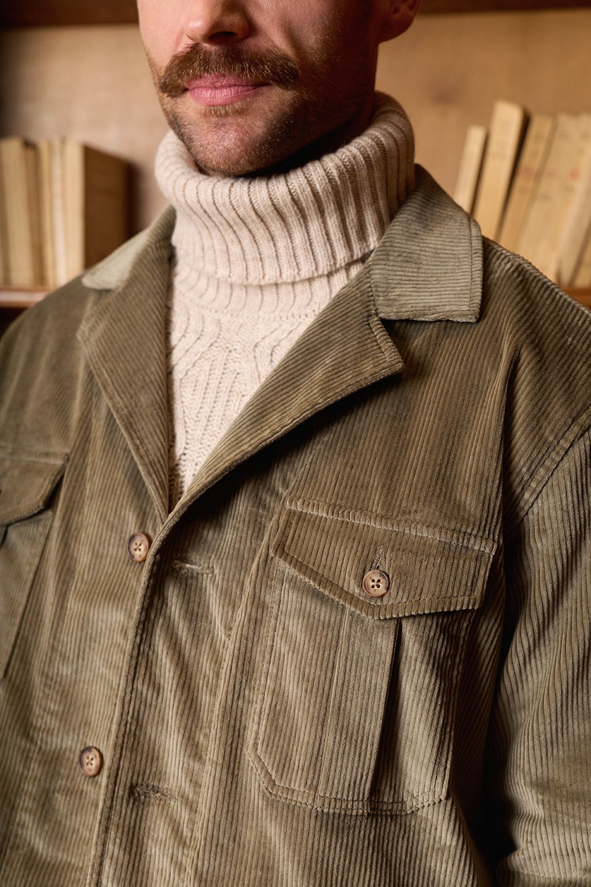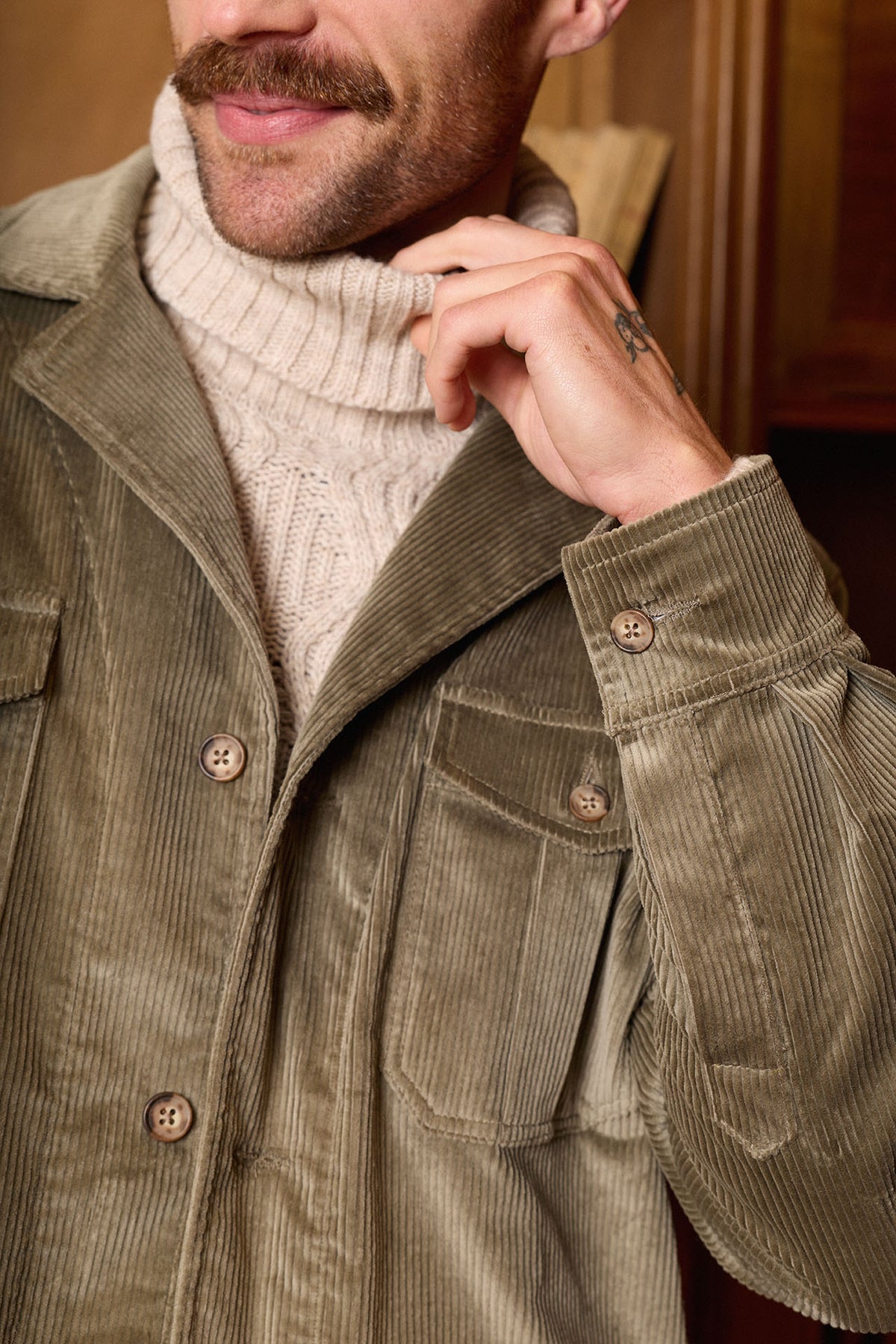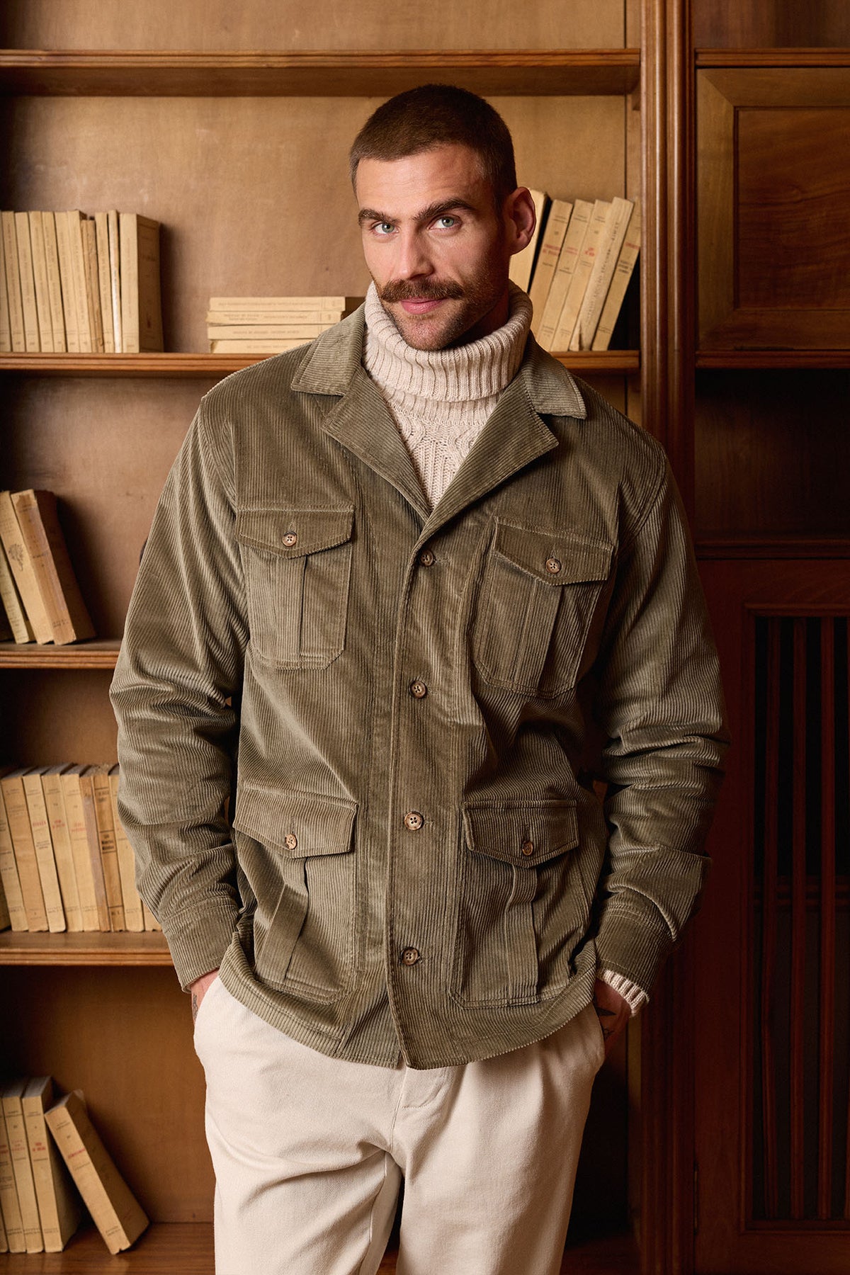 Sobrecamisa de pana verde con cuello hawaiano, cierre frontal mediante botones efecto cuerno y cuatro bolsillos prácticos; cuenta con forro interior en las mangas que aporta mayor comodidad y facilidad al vestir, y está confeccionada en un tejido de alta calidad compuesto por 99% algodón y 1% spandex, ideal para un uso cómodo y versátil.