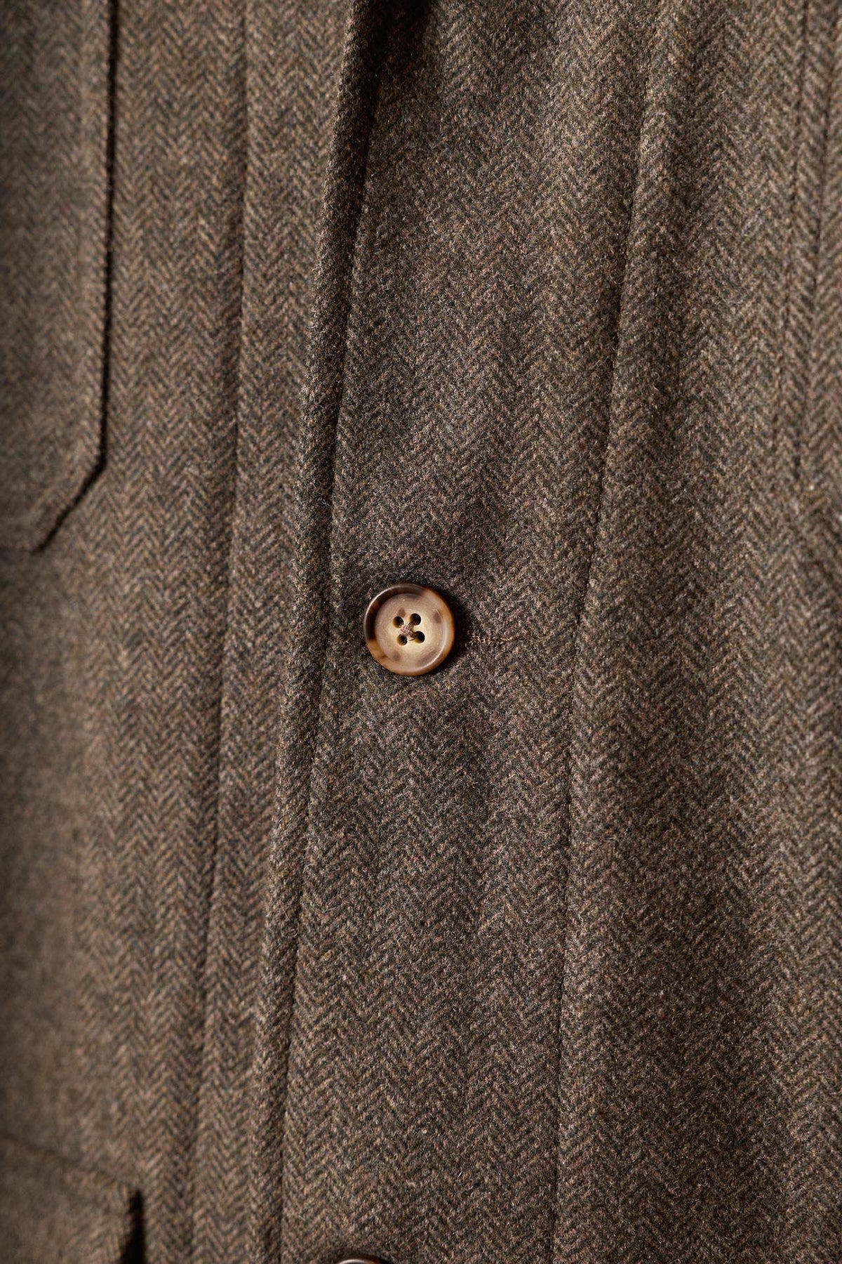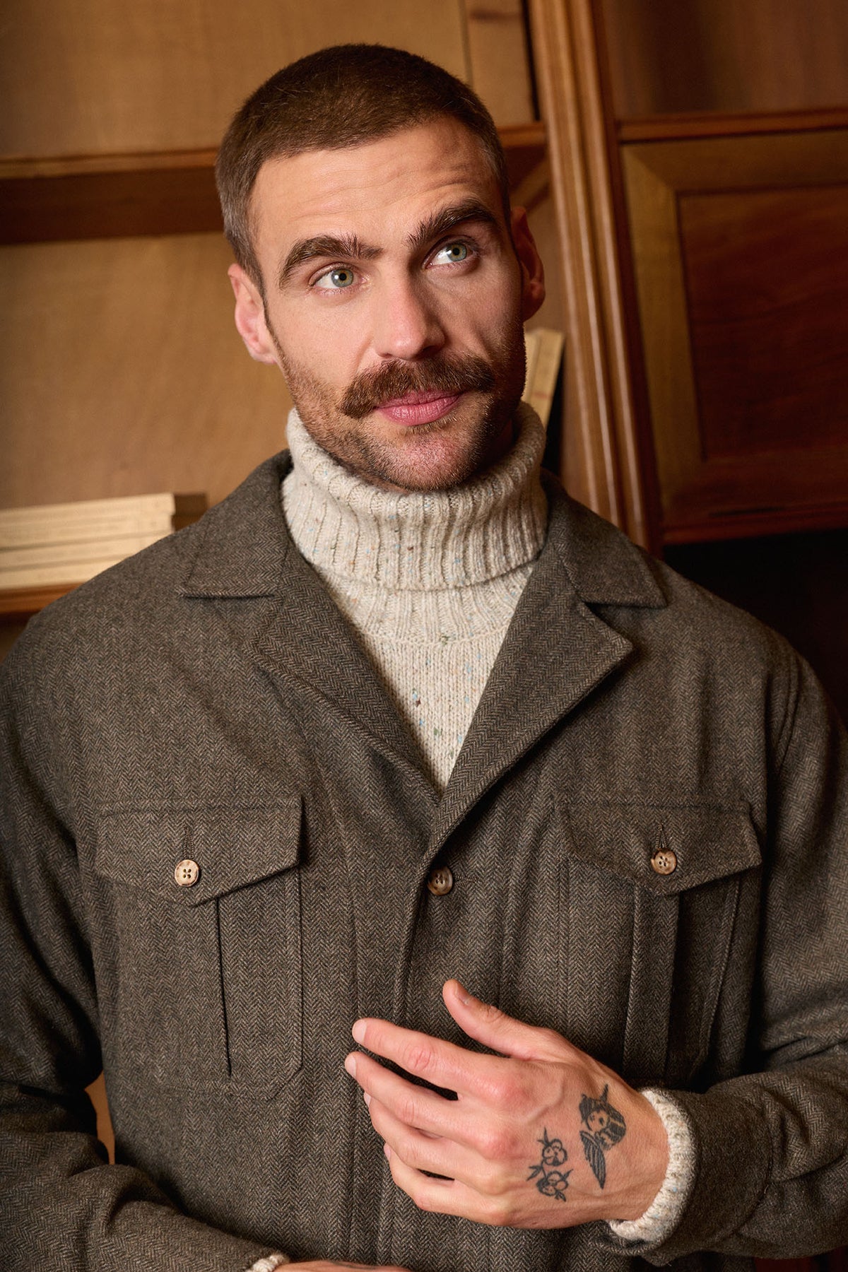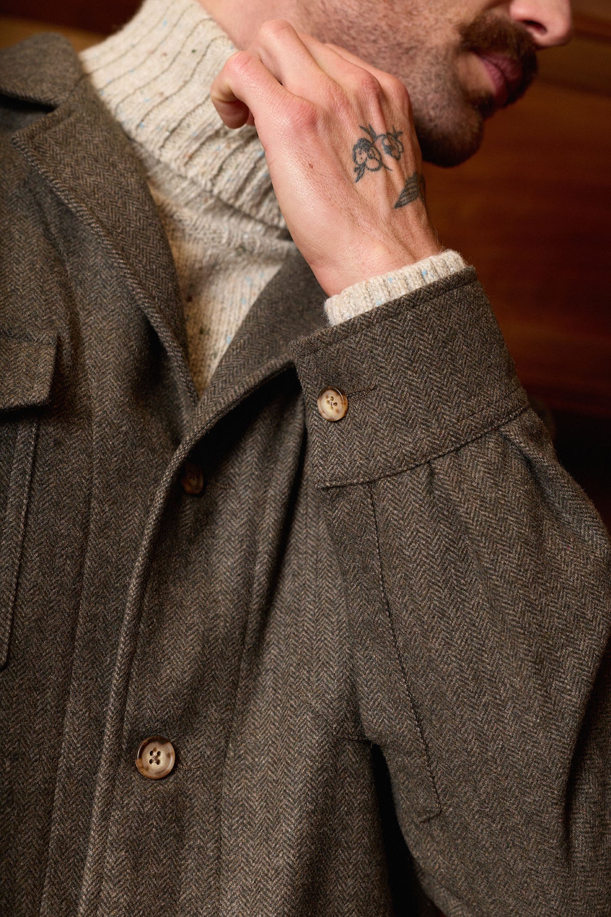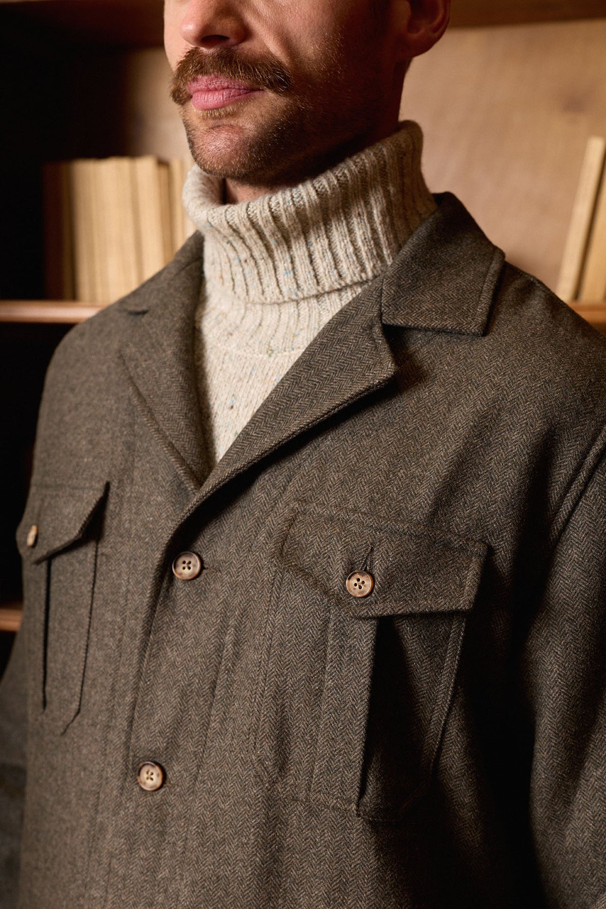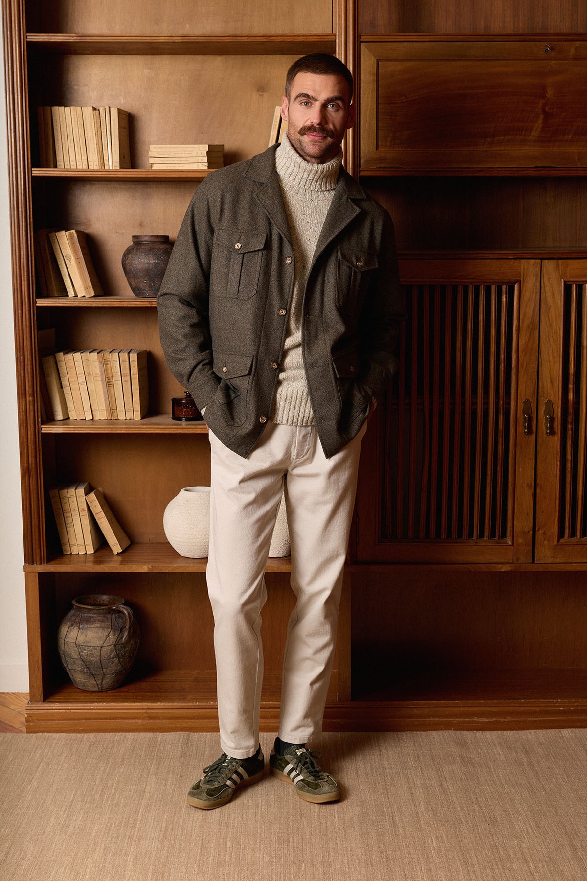 Sobrecamisa de espiga verde confeccionada en un tejido con textura marcada que aporta carácter, diseñada con cuello hawaiano, cierre frontal con botones efecto cuerno y cuatro bolsillos funcionales; su composición combina 50% lana, 40% poliéster y 10% otras fibras, ofreciendo equilibrio entre calidez, resistencia y confort.