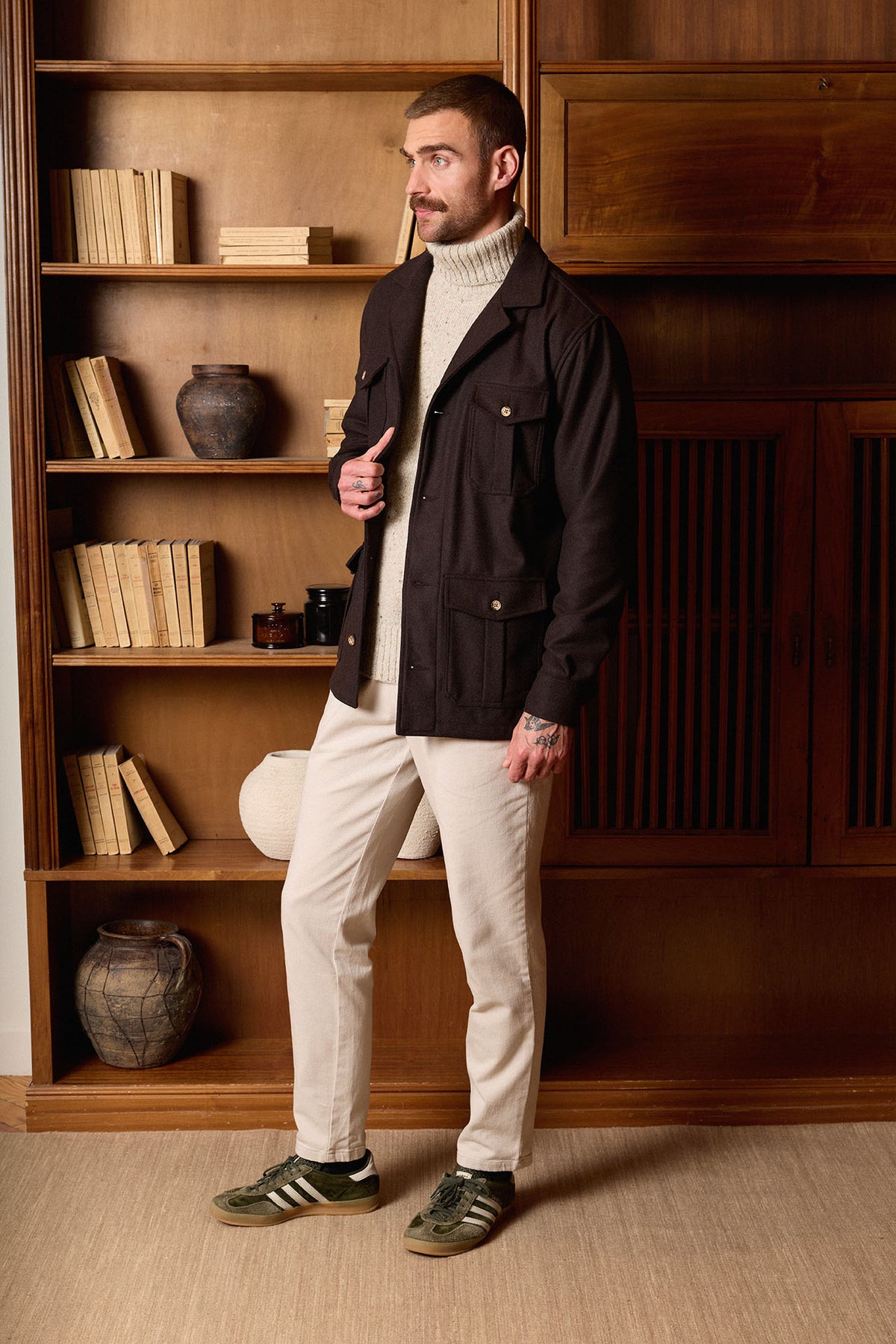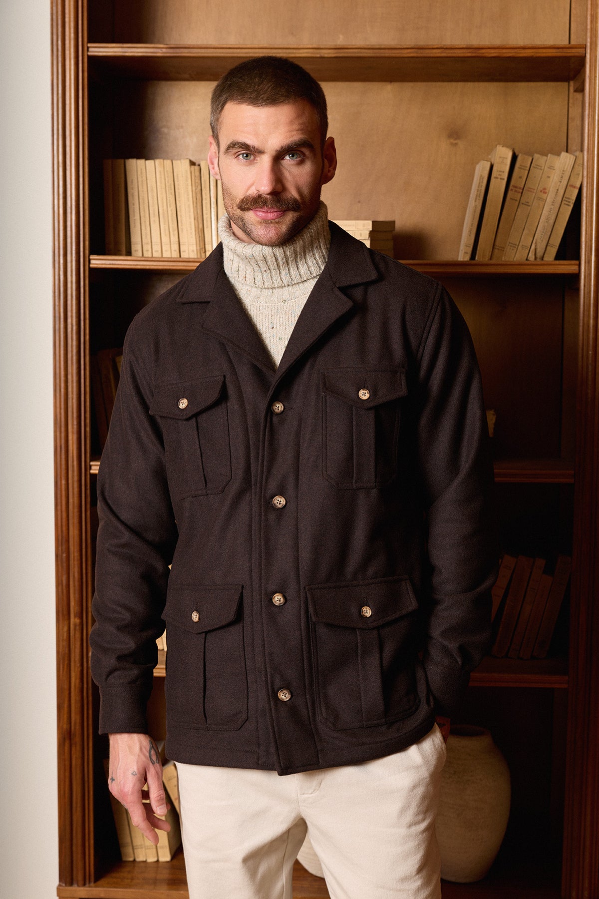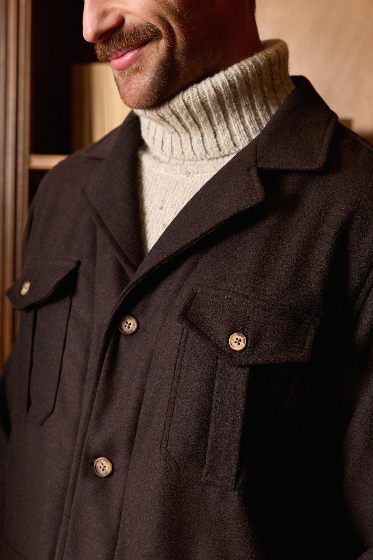 Sobrecamisa marrón confeccionada en un tejido resistente y confortable, diseñada con cuello hawaiano, cierre frontal con botones efecto cuerno y cuatro bolsillos funcionales; su composición combina 45% poliéster, 30% lana y 25% nylon, ofreciendo un equilibrio óptimo entre durabilidad, calidez y comodidad.
