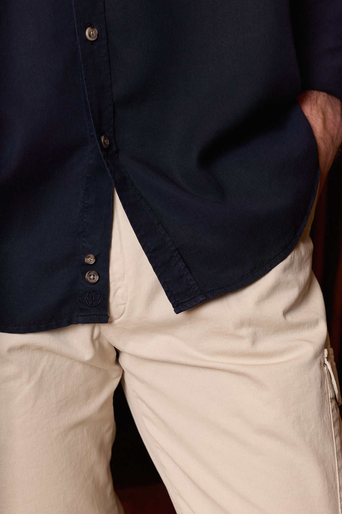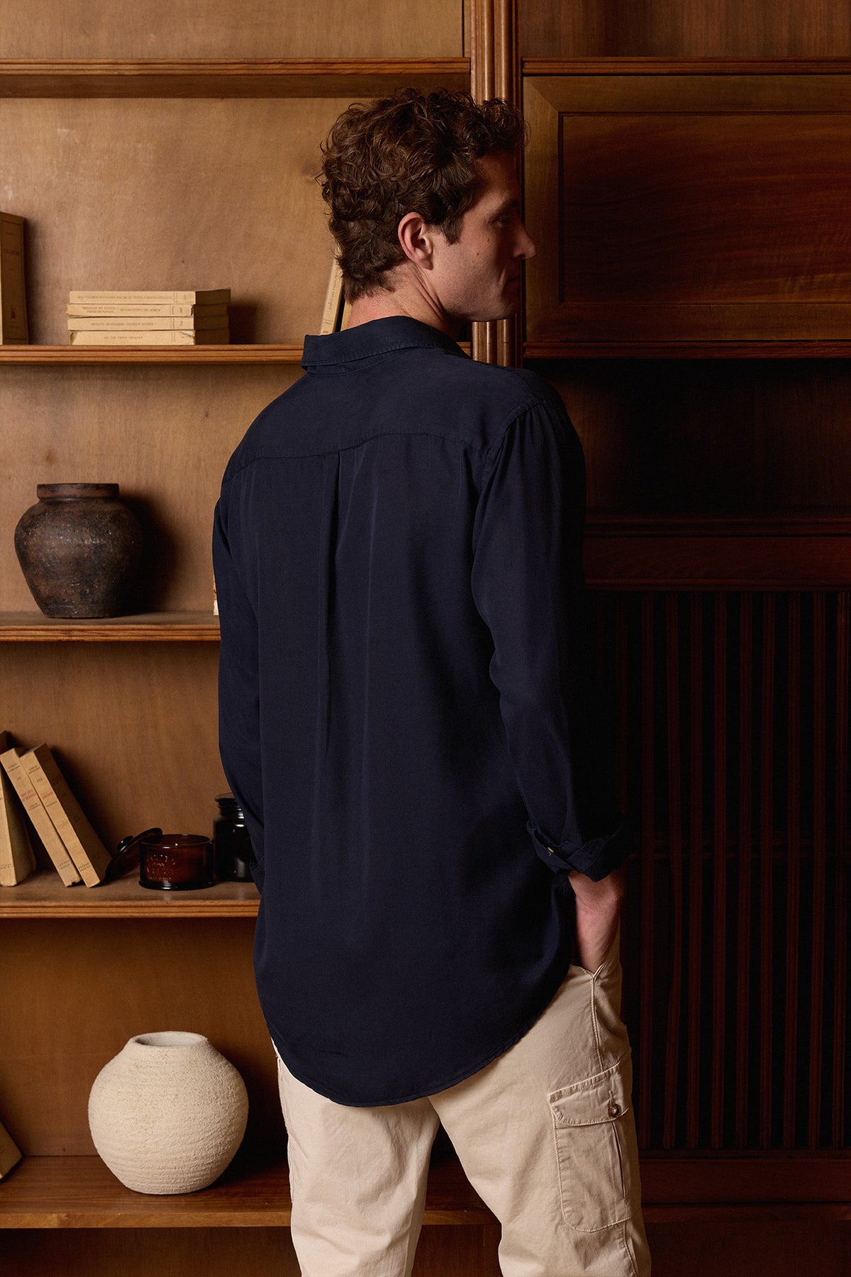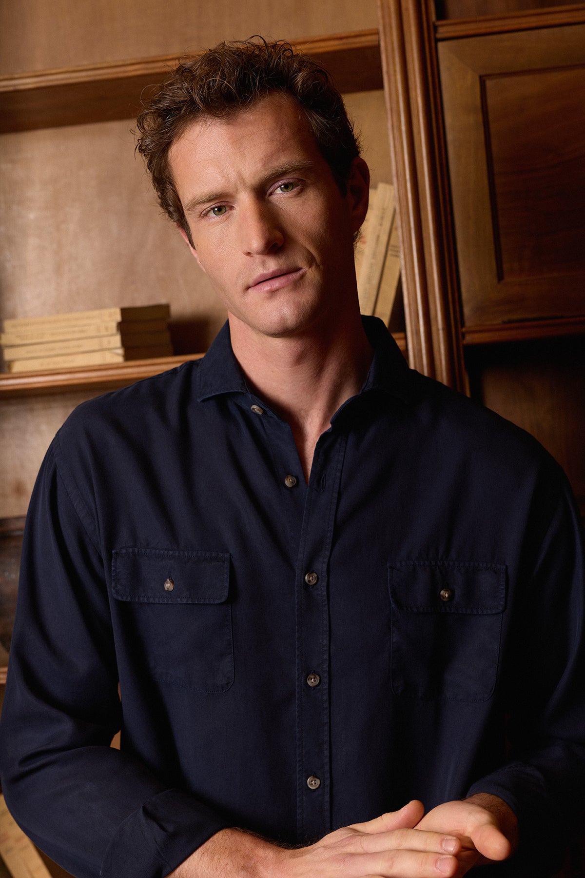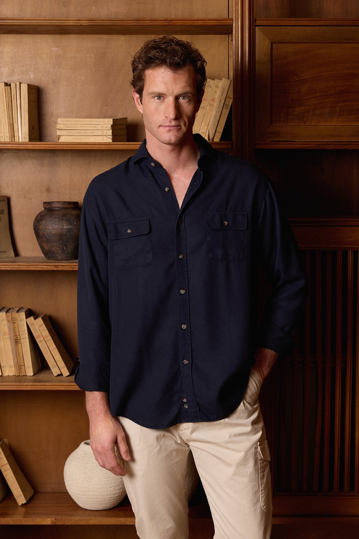 Camisa de algodón azul marino confeccionada en Ciudad Real, con lavado suavizante que aporta flexibilidad, frescura y confort al tacto. Incluye doble bolsillo en el pecho, cuello italiano blando, tapeta con botones cuerno, espalda con tablón central, puño simple y logo oculto. Prenda resistente, elegante y versátil para otoño e invierno.