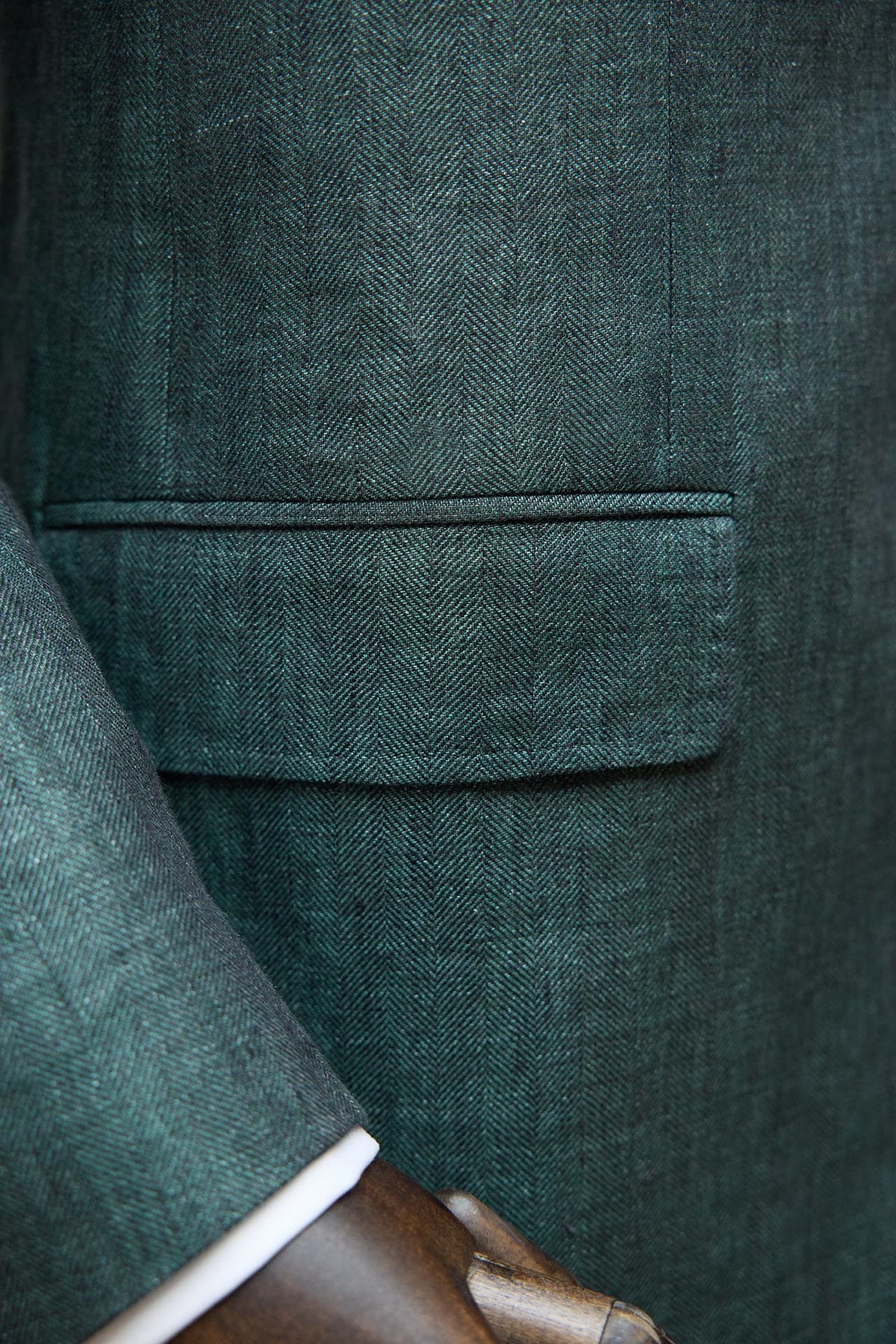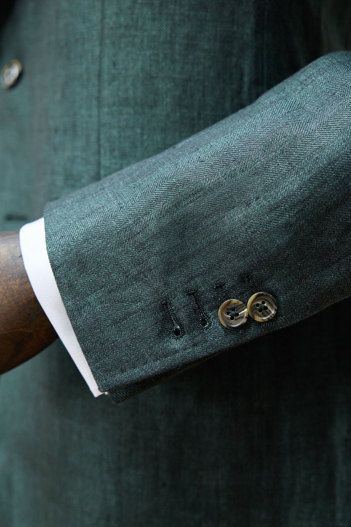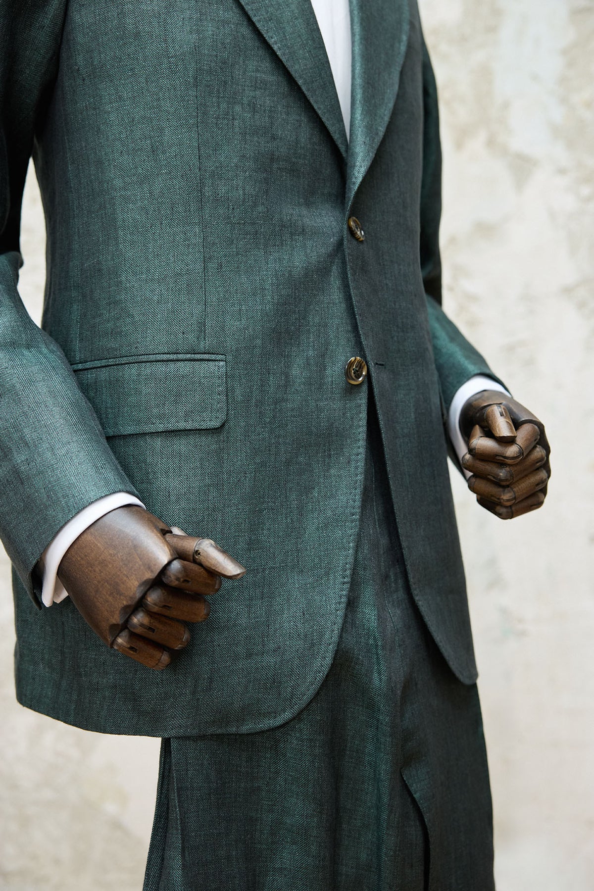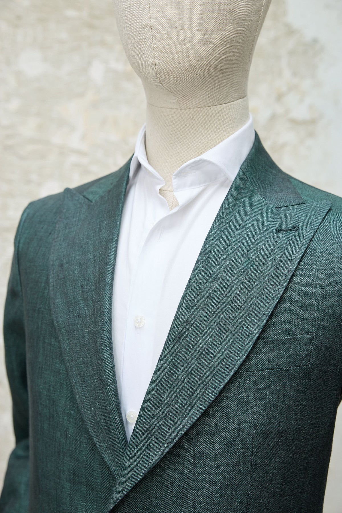 Americana de lino en verde, confeccionada en Coimbra, Portugal, que combina frescura y ligereza con suavidad y estructura. Presenta solapa punta de lanza de 11 cm, costuras marcadas, bolsillos inclinados con cerillera y botones de cuerno natural. Prenda transpirable, confortable y versátil, ideal para meses templados y de estilo elegante y artesanal.