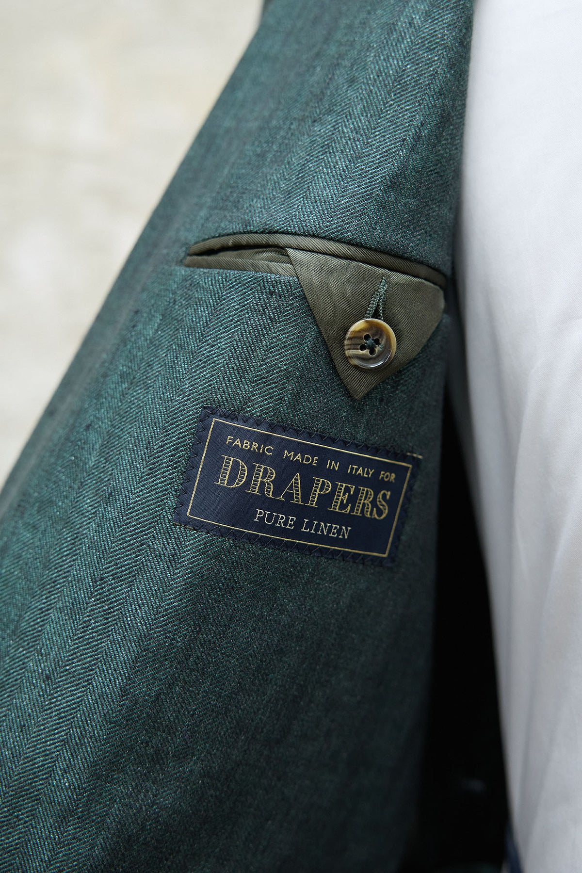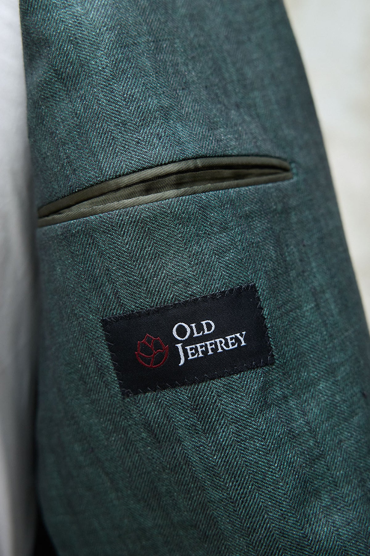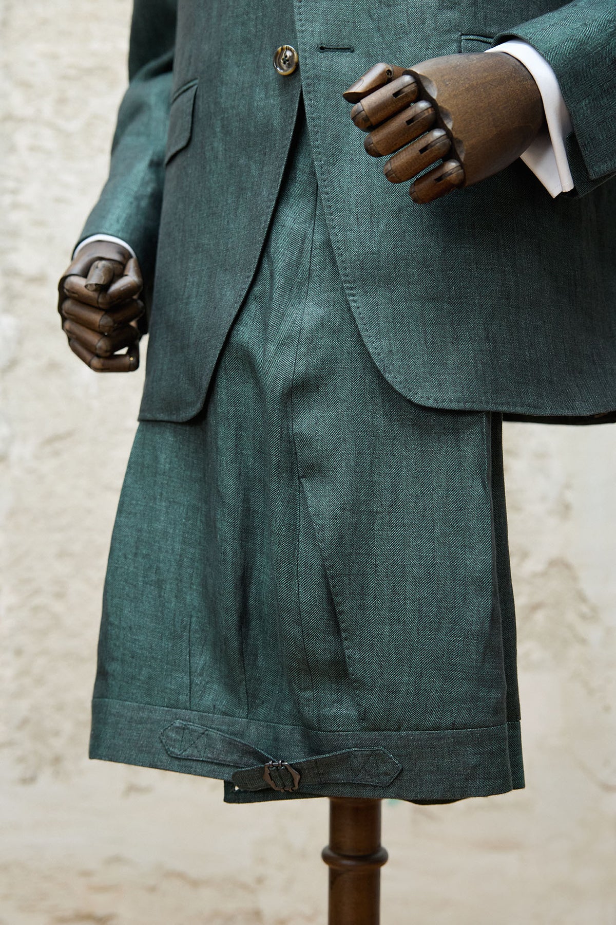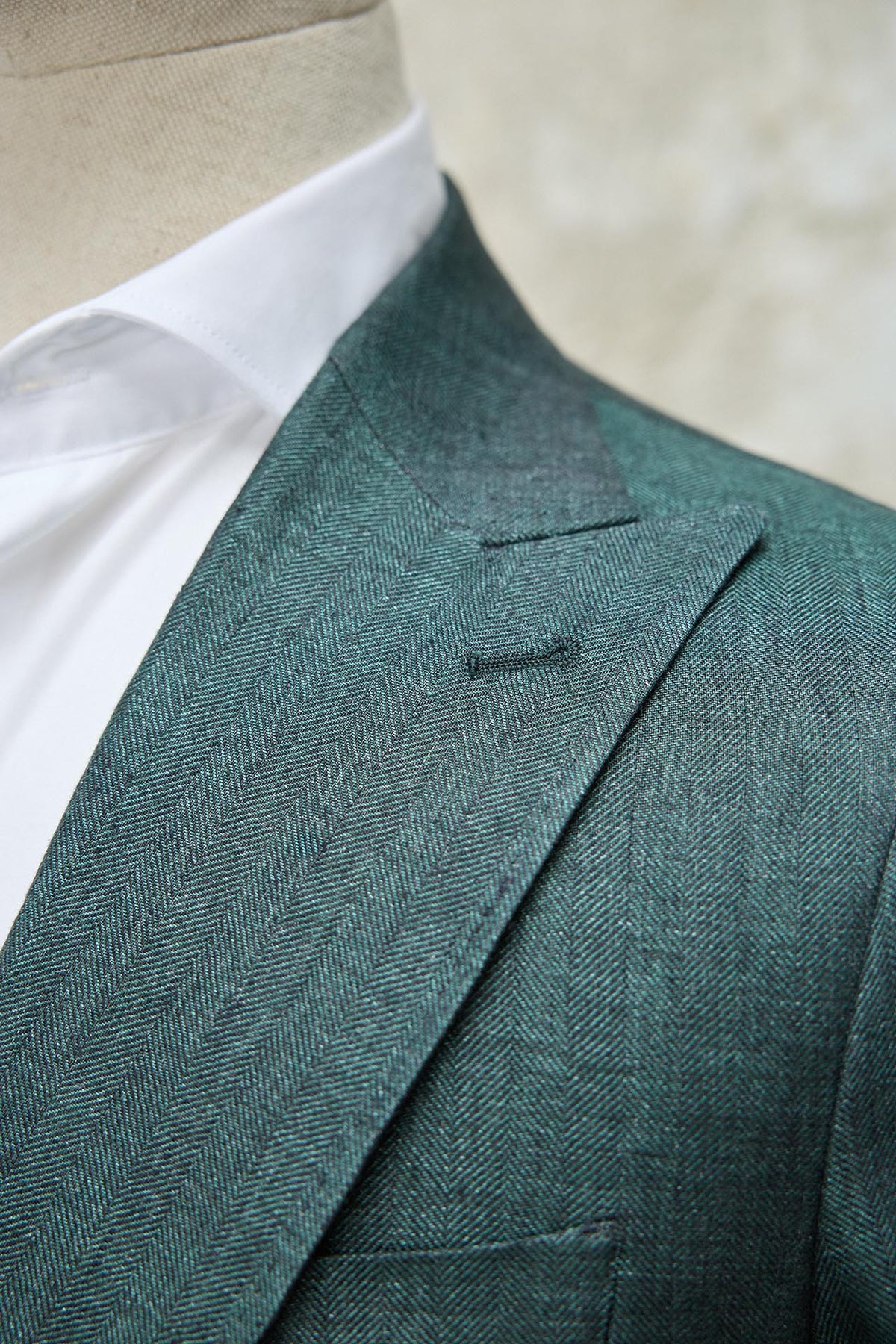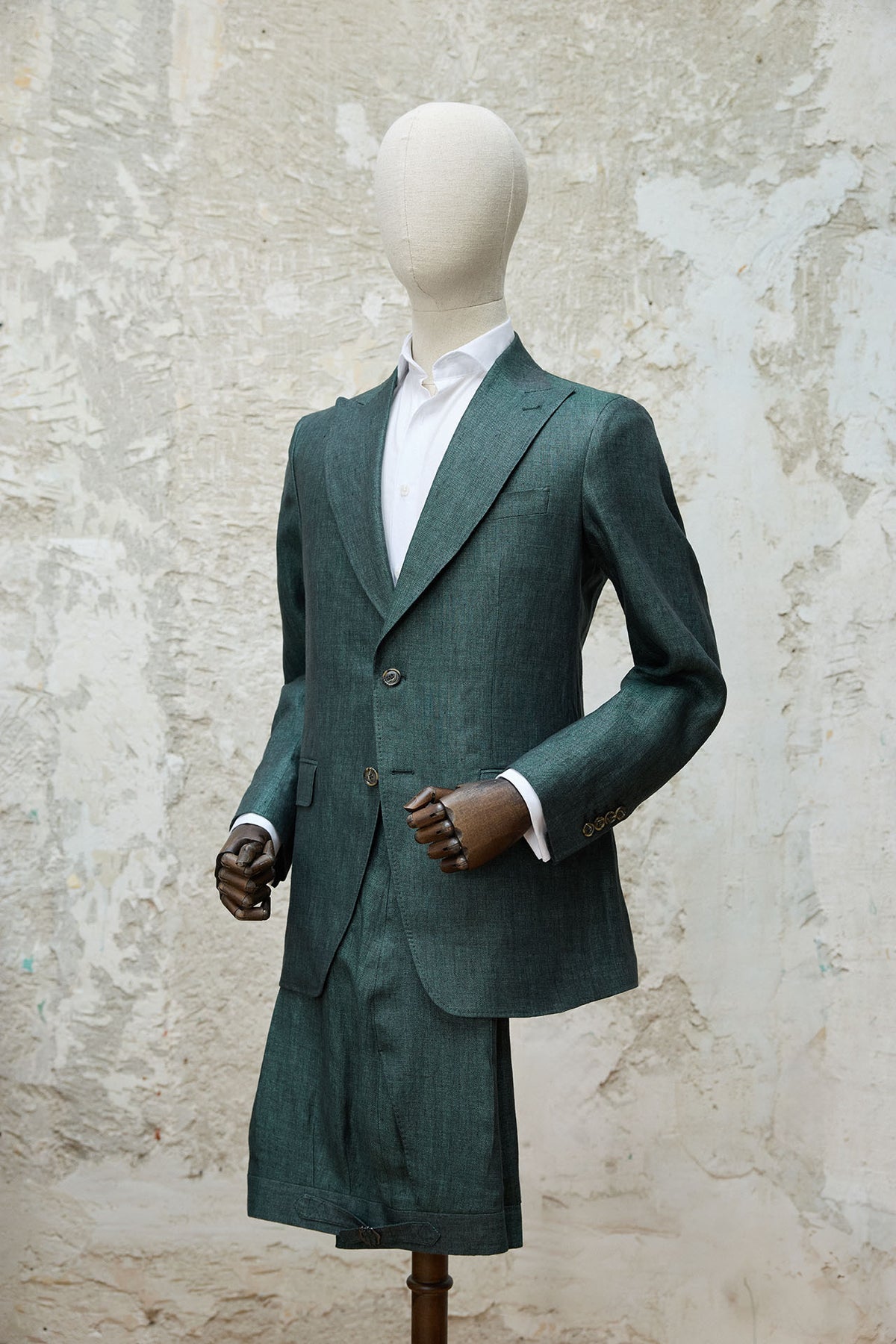 Americana de lino en verde, confeccionada en Coimbra, Portugal, que combina frescura y ligereza con suavidad y estructura. Presenta solapa punta de lanza de 11 cm, costuras marcadas, bolsillos inclinados con cerillera y botones de cuerno natural. Prenda transpirable, confortable y versátil, ideal para meses templados y de estilo elegante y artesanal.