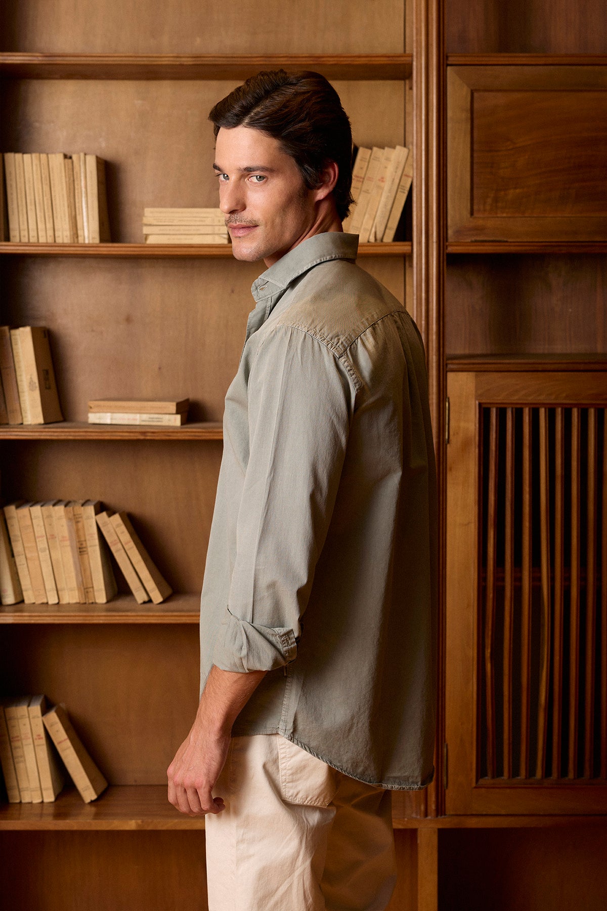 Camisa Sarga Algodón Verde Seco Desgastado Botón Cuerno