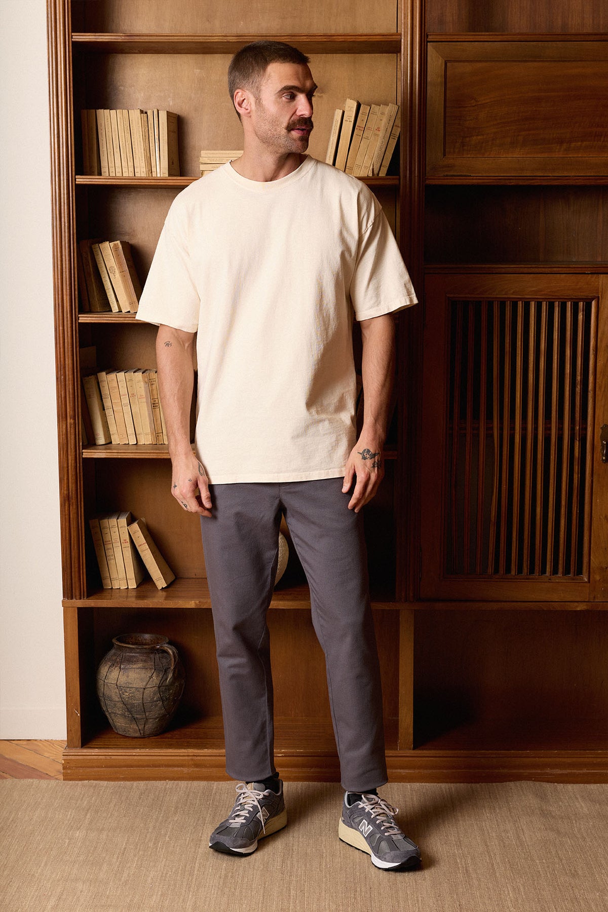 Pantalón chino confeccionado en Guimarães (Portugal) en tejido 100% algodón. Cuenta con cintura elástica con cordón, cierre de botones efecto cuerno, corte Regular-Slim y bolsillos laterales. Disponible en color azul marino, un básico versátil para cualquier ocasión.
