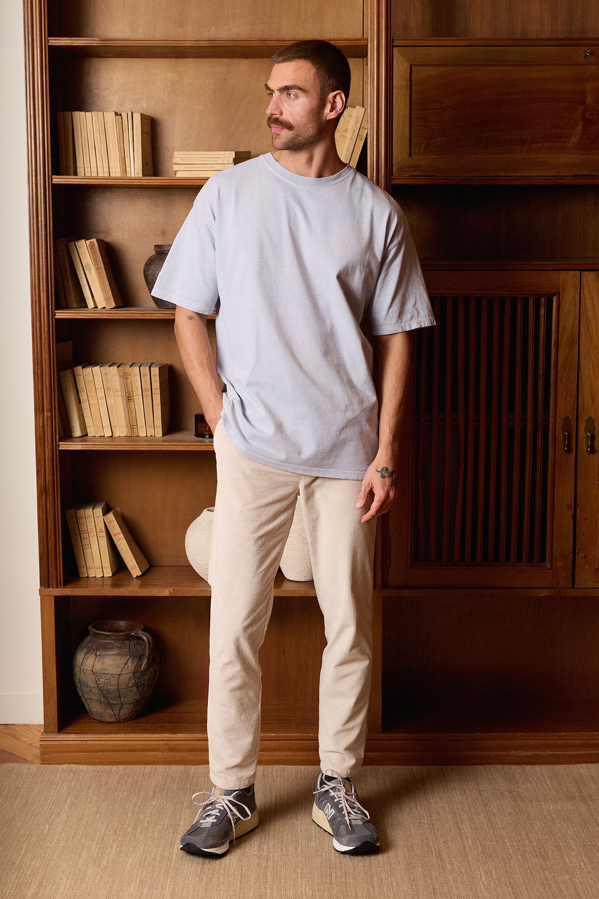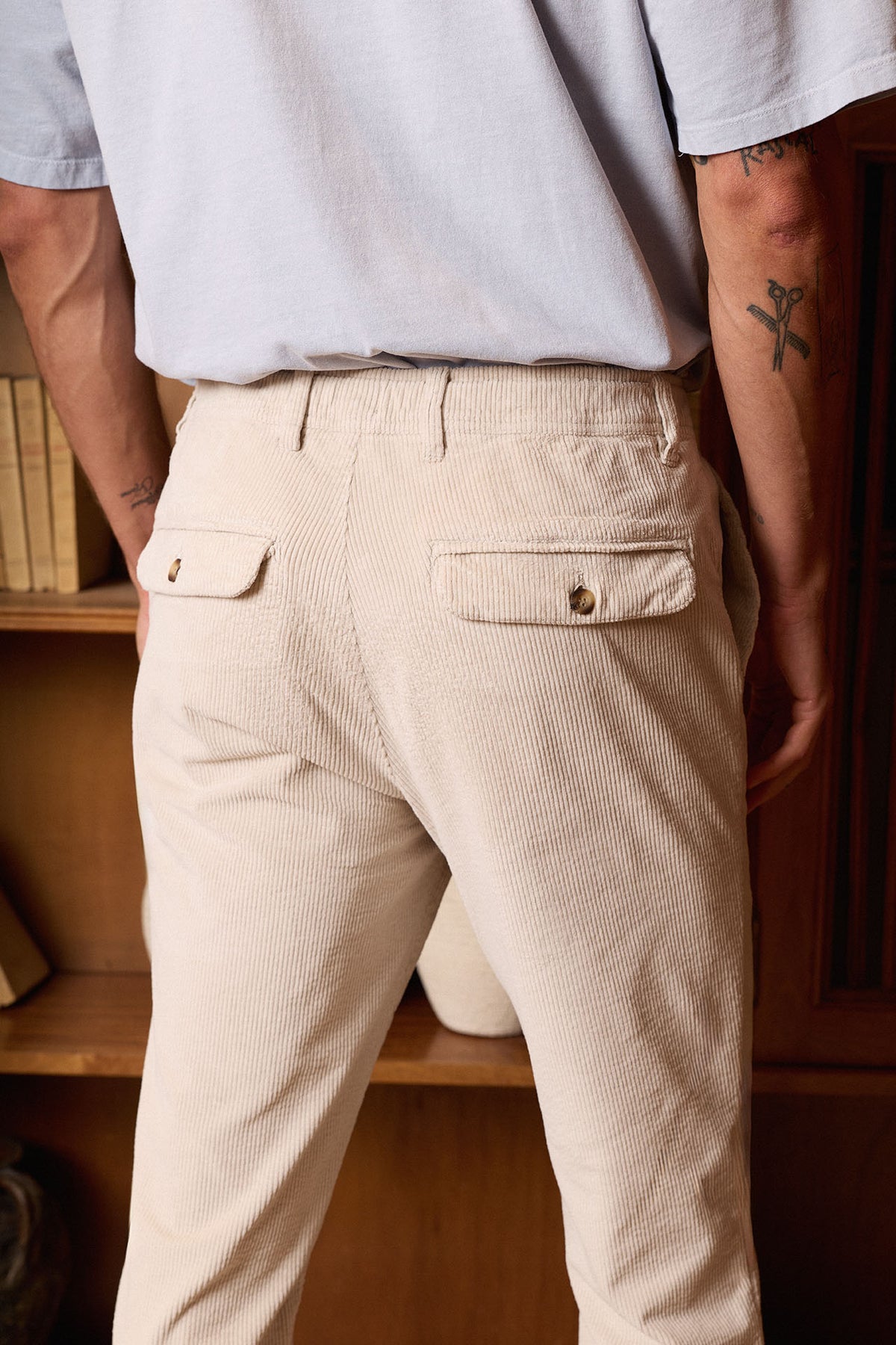 Pantalón chino confeccionado en Guimarães (Portugal) en tejido de pana compuesto por 97% algodón y 3% elastano. Cuenta con cintura elástica con cordón, cierre de botones efecto cuerno, corte Regular-Slim y bolsillos laterales. Disponible en color hielo, un básico versátil para cualquier ocasión.