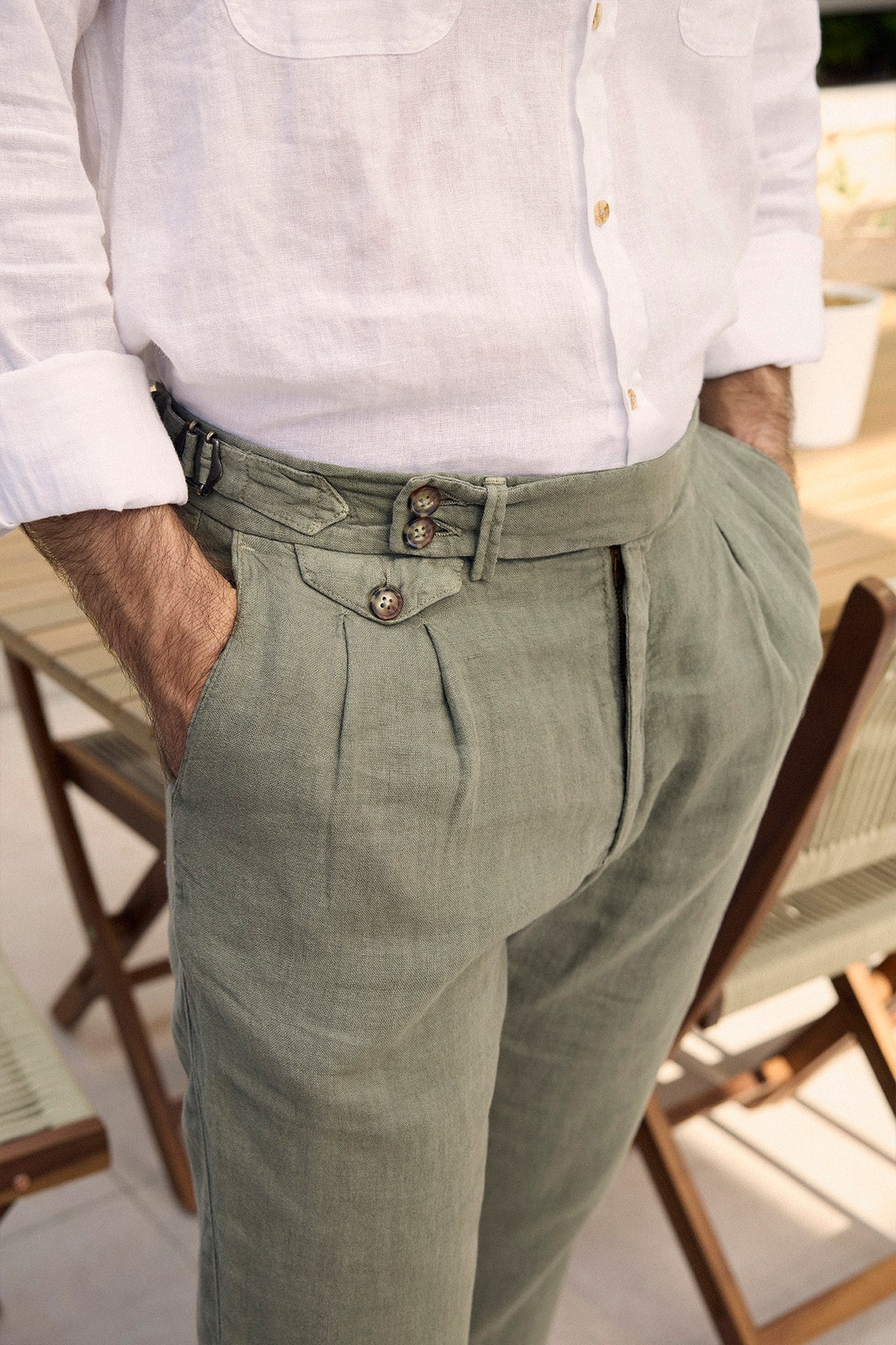 The pants that will last you all summer long. Lightweight, cool, and with that touch of relaxed elegance that summer demands. These 100% linen pants in hunting green are a sophisticated and versatile option for warmer days: ideal for both country getaways and lunch in the city. Their natural, breathable fabric makes them a must-have when temperatures rise.