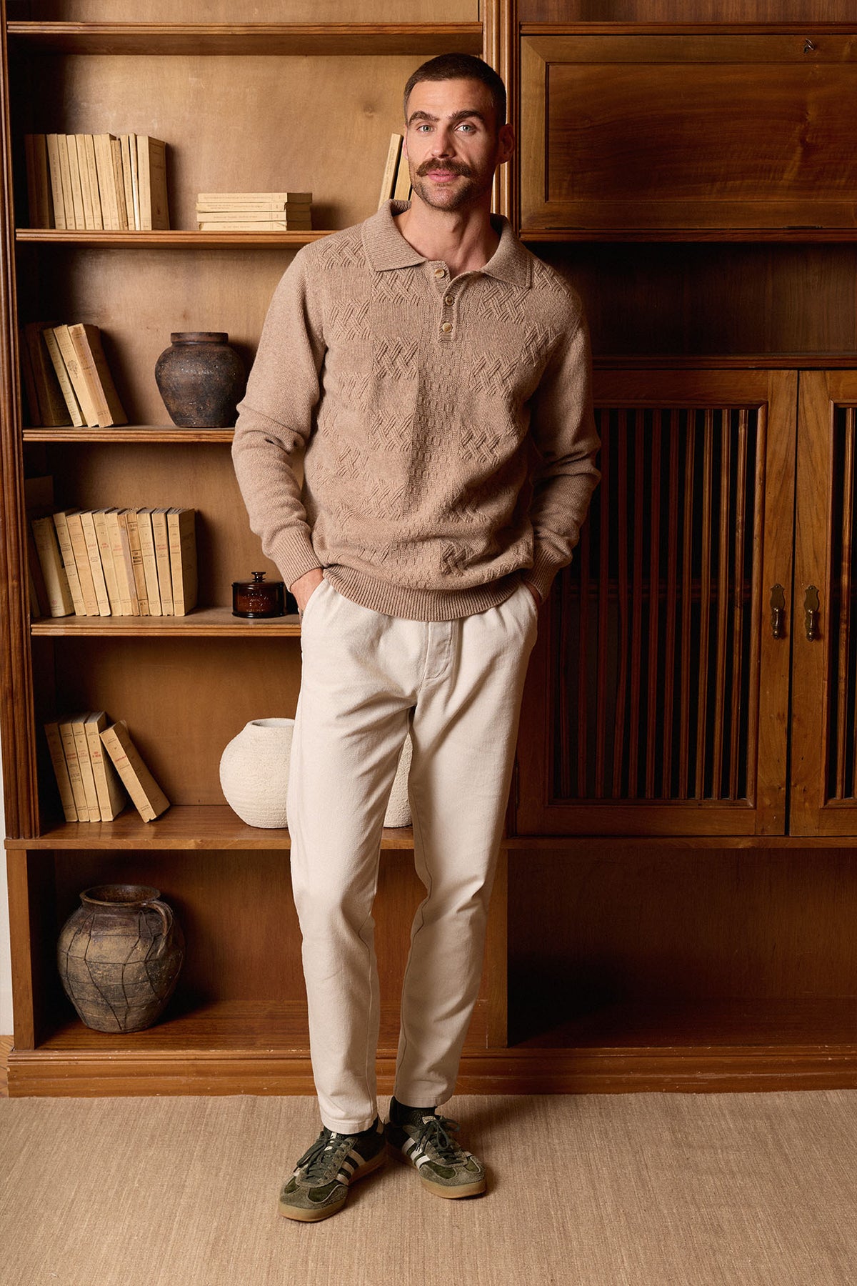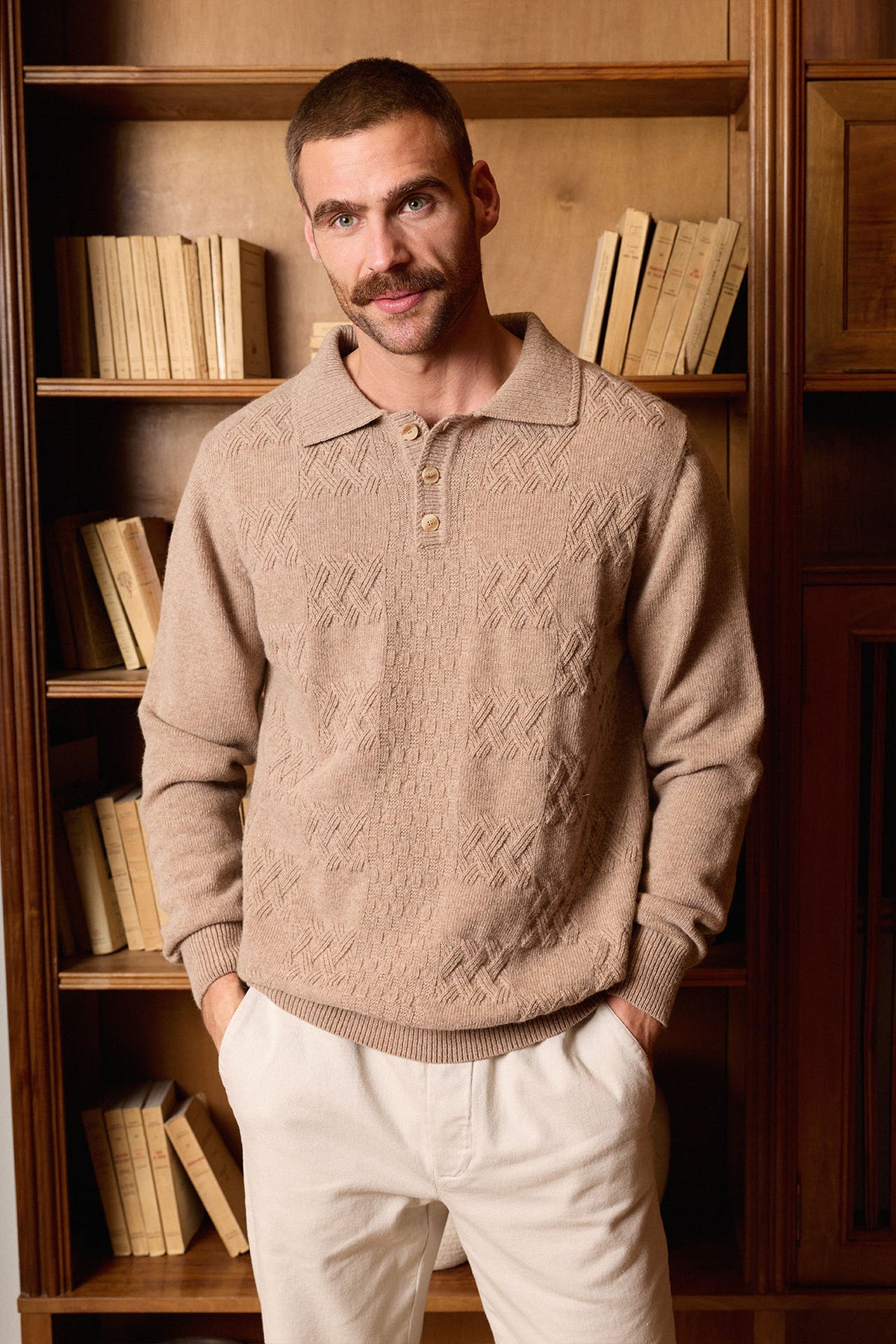 Polo de punto marrón topo confeccionado en lana extrafina 100%, con relieve texturizado que aporta profundidad y carácter. Incorpora cuello clásico y botones de cuerno frontales, combinando confort y diseño en una prenda atemporal pensada para un armario actual y versátil.