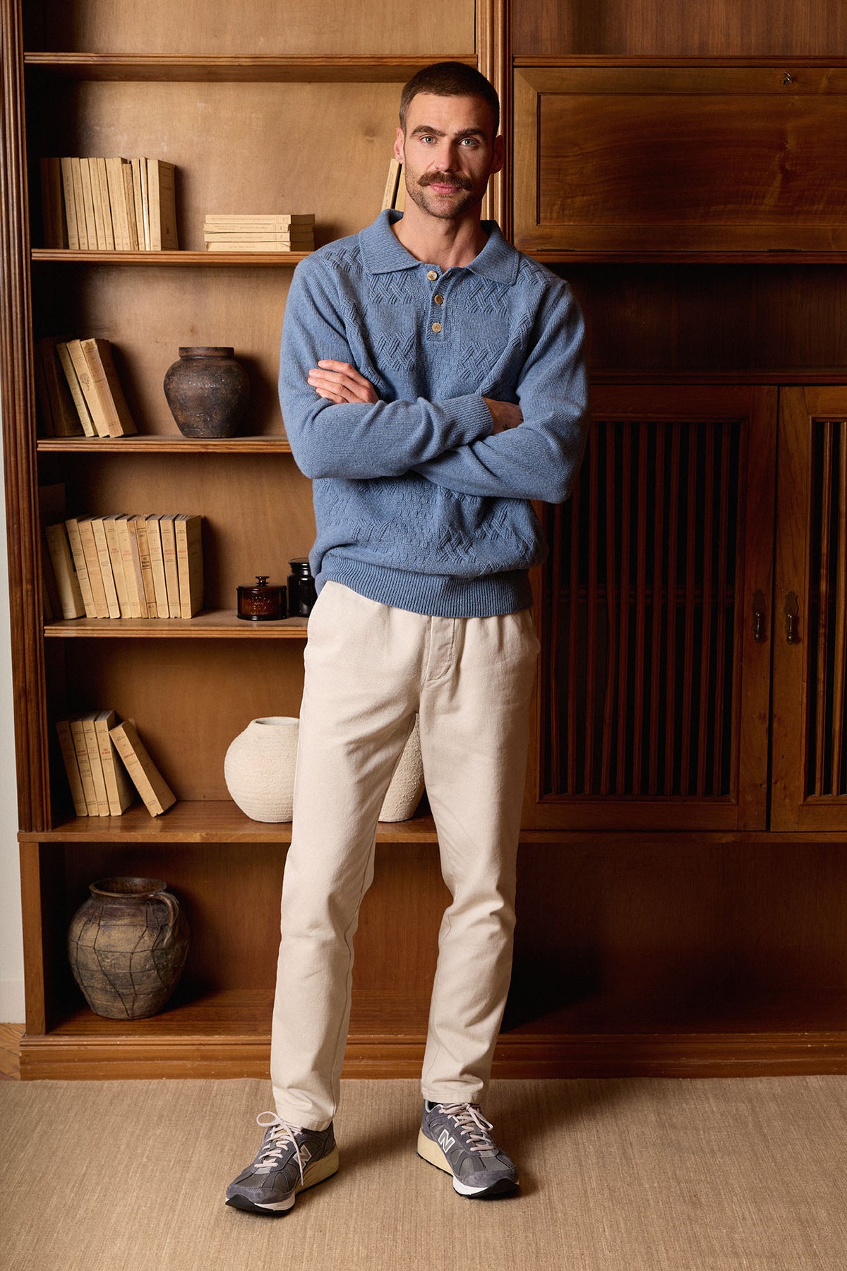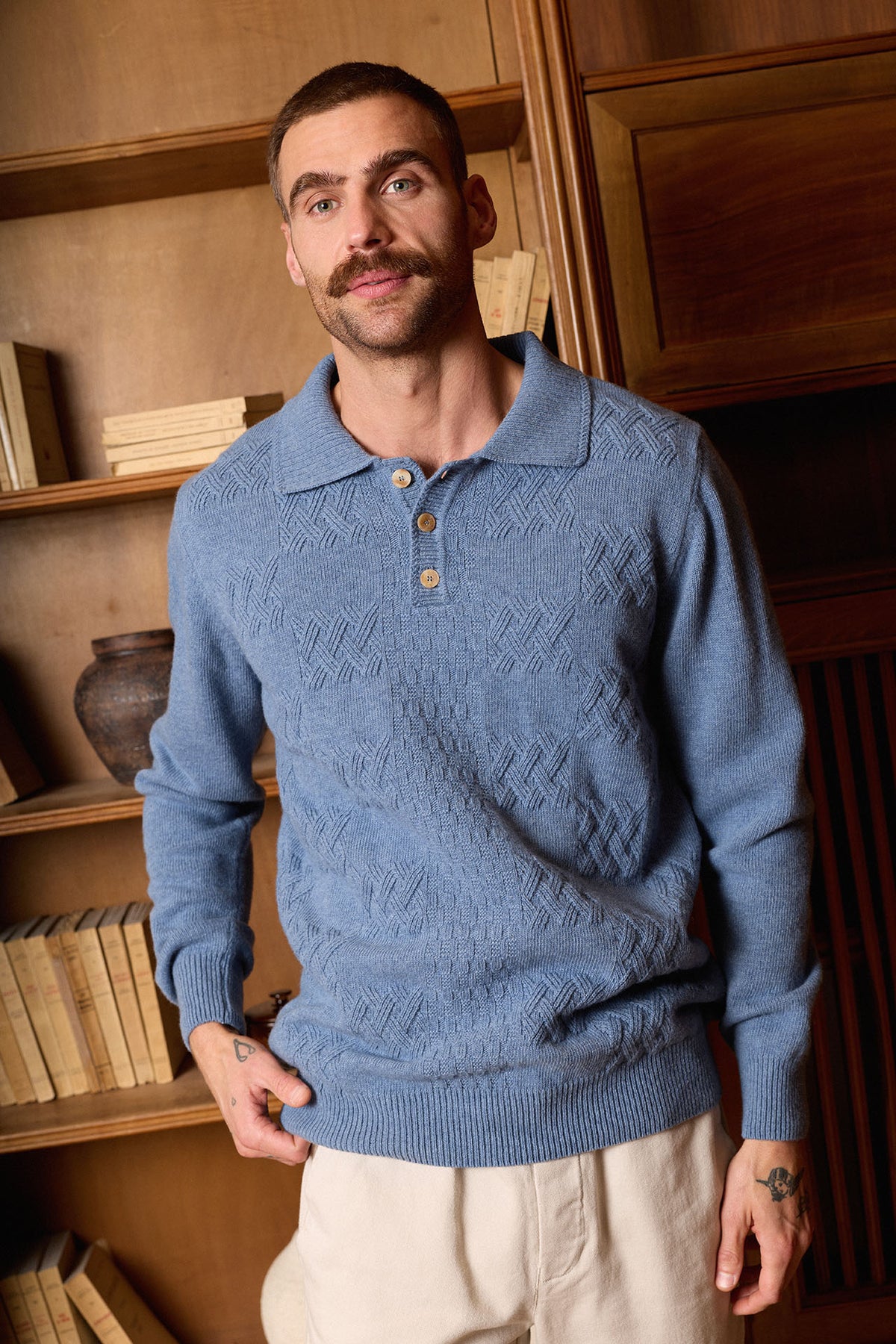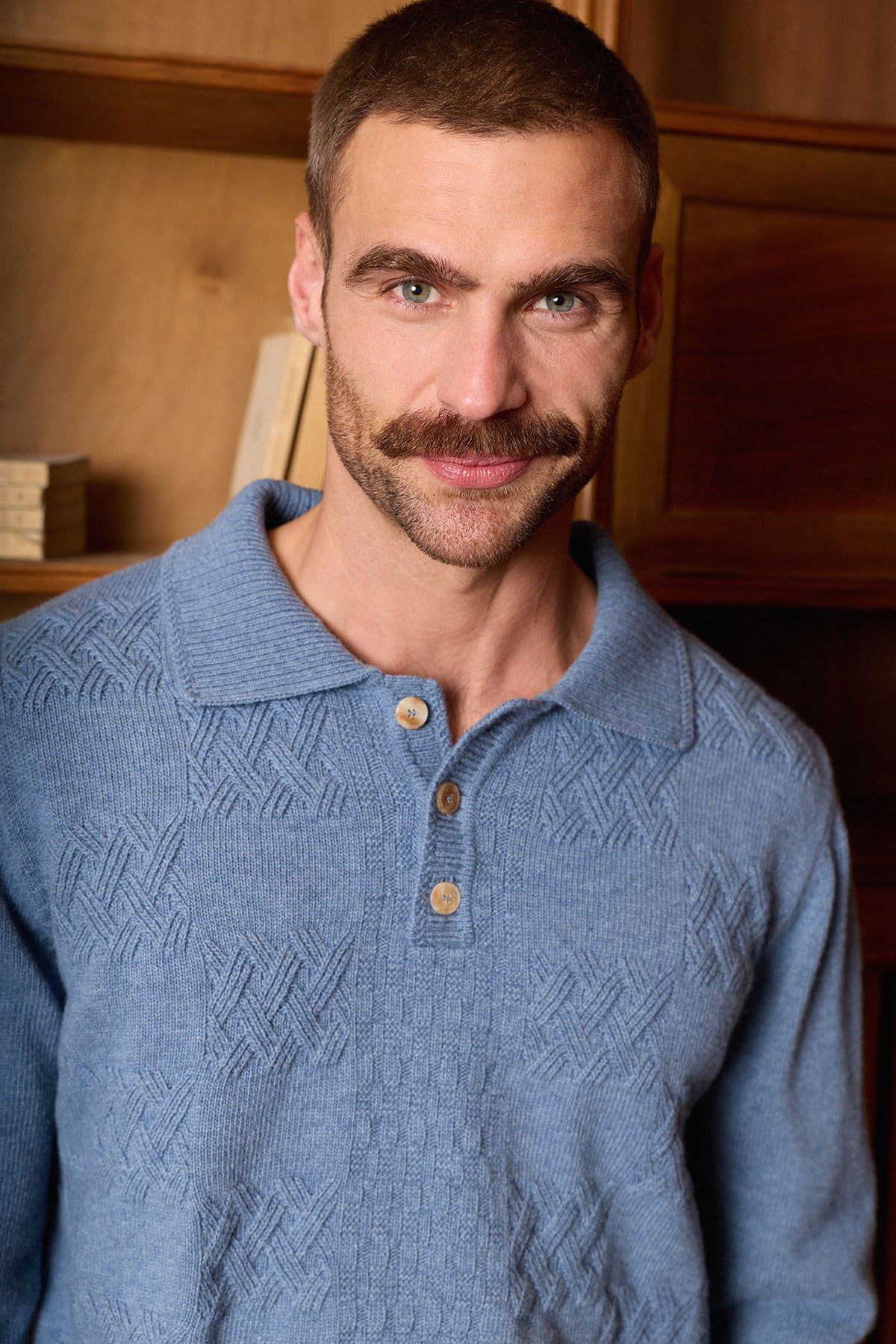 Polo de punto azul claro confeccionado en lana extrafina 100%, con relieve texturizado que aporta profundidad y carácter. Incorpora cuello clásico y botones de cuerno frontales, combinando confort y diseño en una prenda atemporal pensada para un armario actual y versátil.