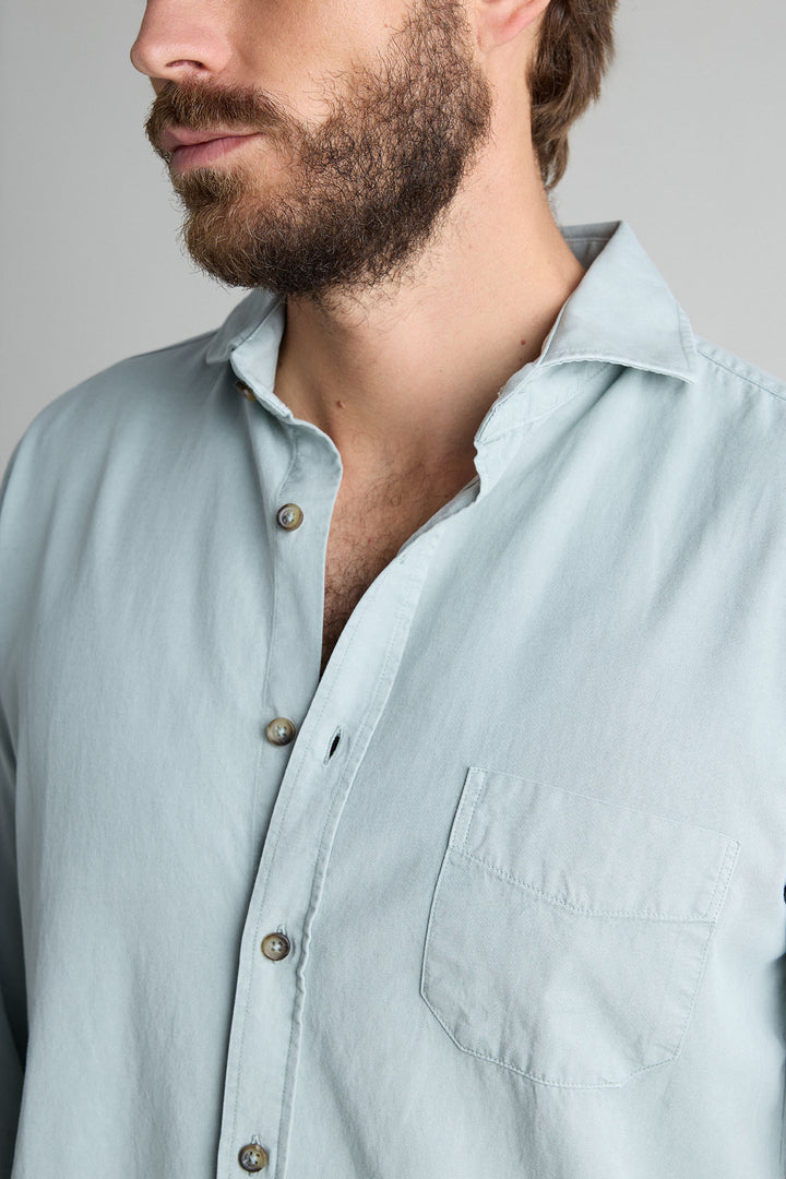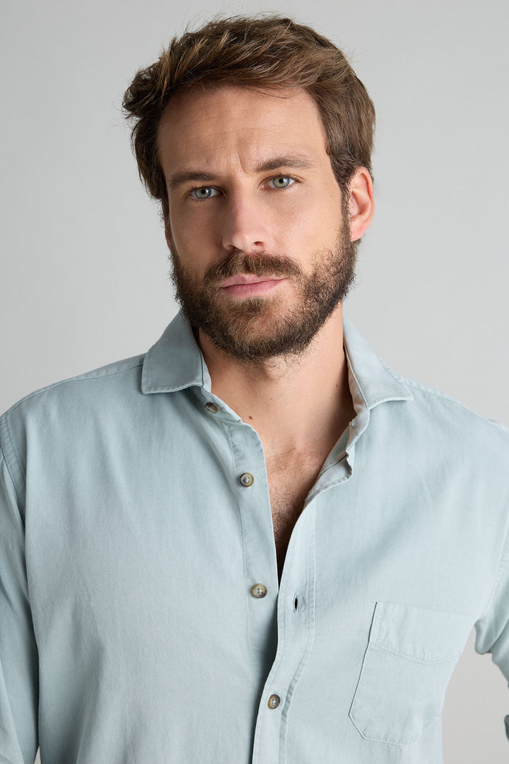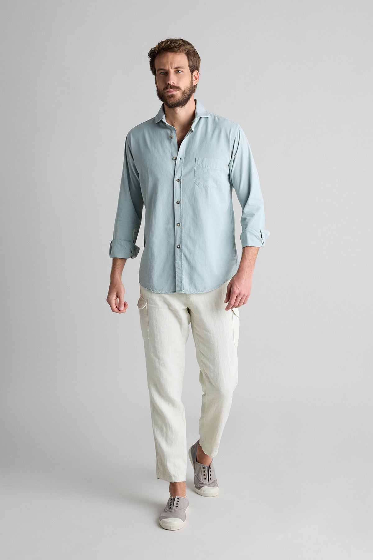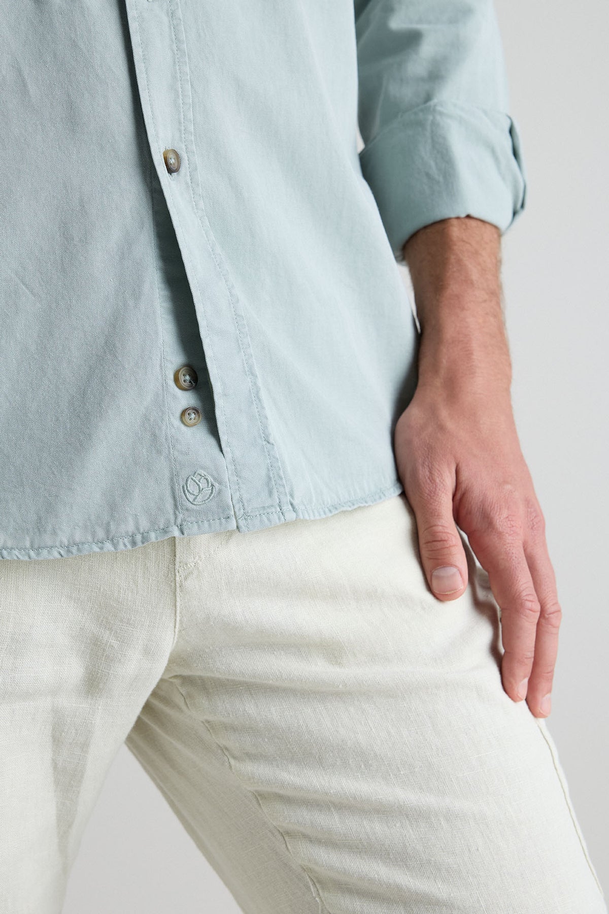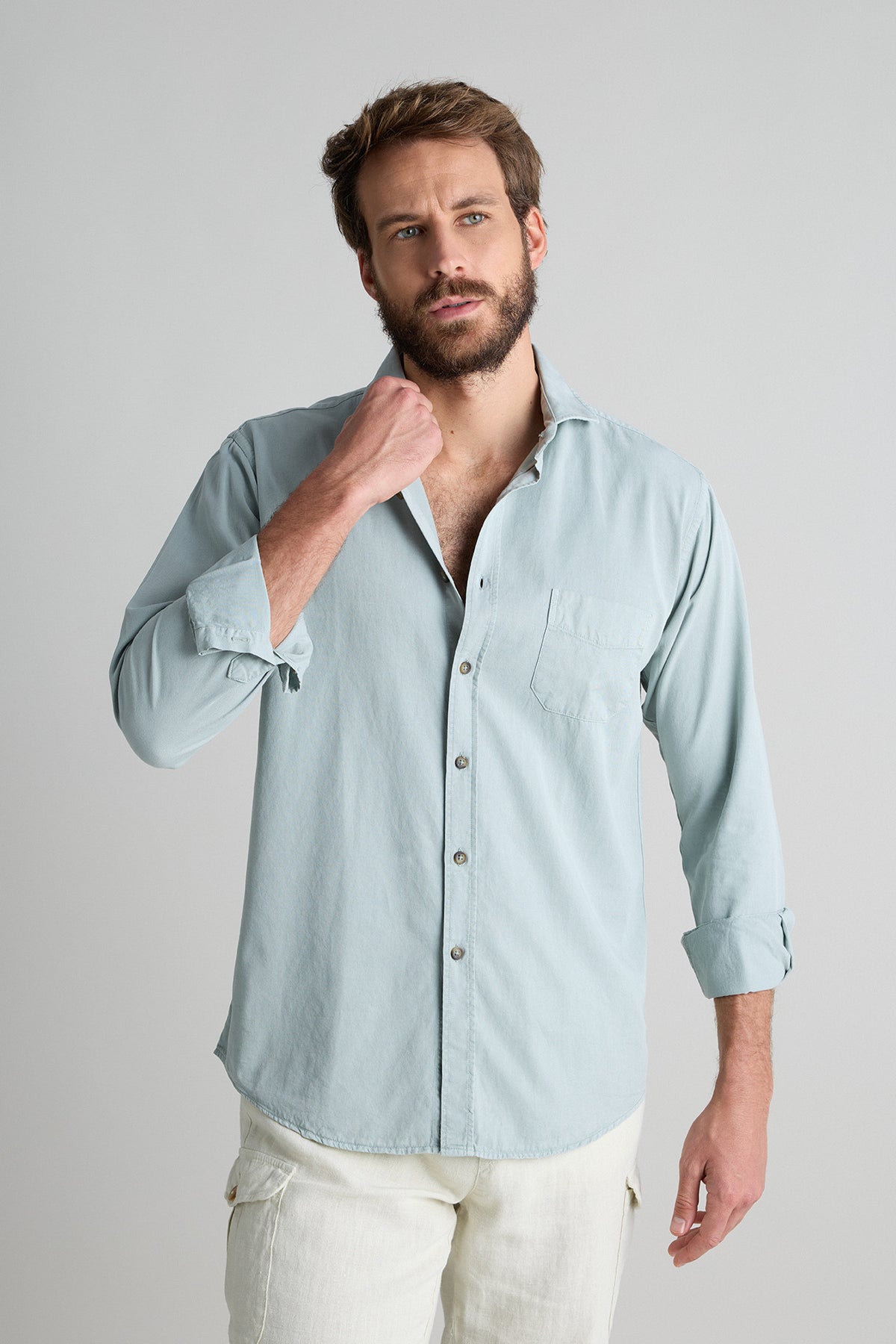 Camisa fabricada en Córdoba con tejido compuesto por 100% algodón con tencel en color verde seco con colorantes naturales.
