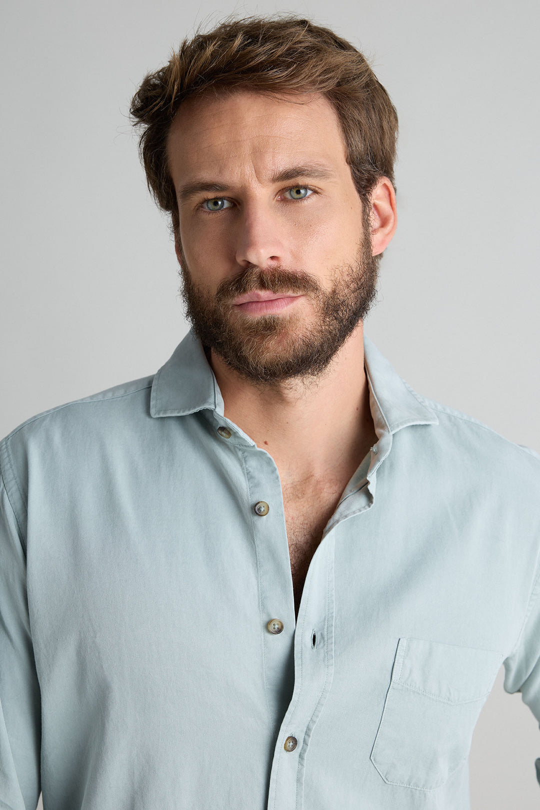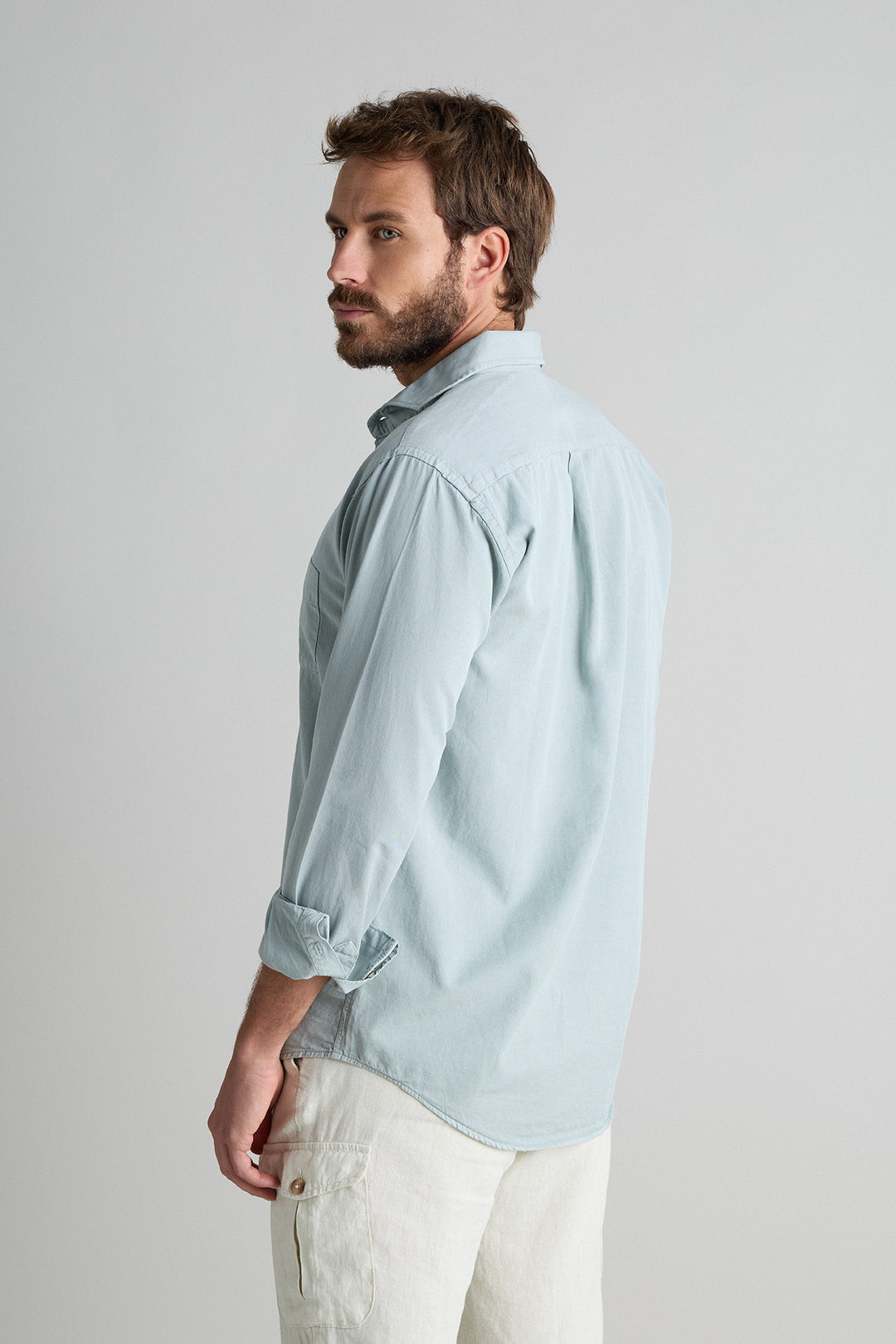 Posterior a su tintado, se ha procedido a realizar un lavado de suavidad a la camisa a fin de dotarla de un mano suave y cómoda en contacto con la piel.
