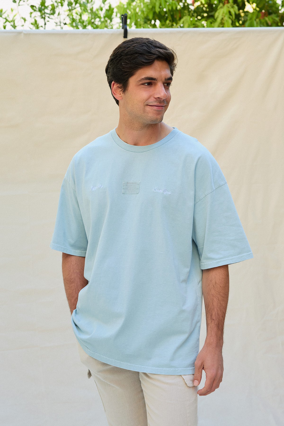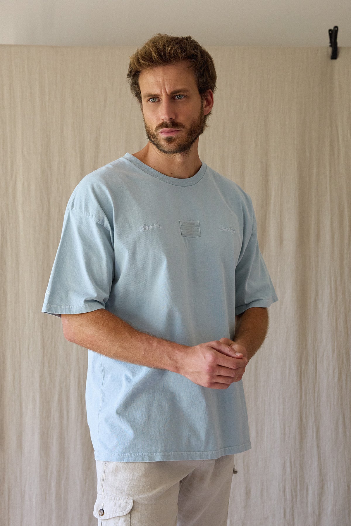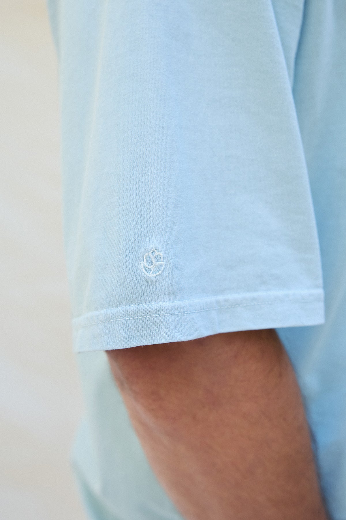 Camiseta confeccionado con 100% algodón orgánico de hilatura open-end de 210 g/m2. Se ha procedido a tintar la prenda en color amarillo napolitano desgastado con tintes naturales y, de manera posterior, se ha sometido a un proceso de lavado que le confiere un aspecto vintage & eighties. Entre sus principales detalles de diseño destacan: