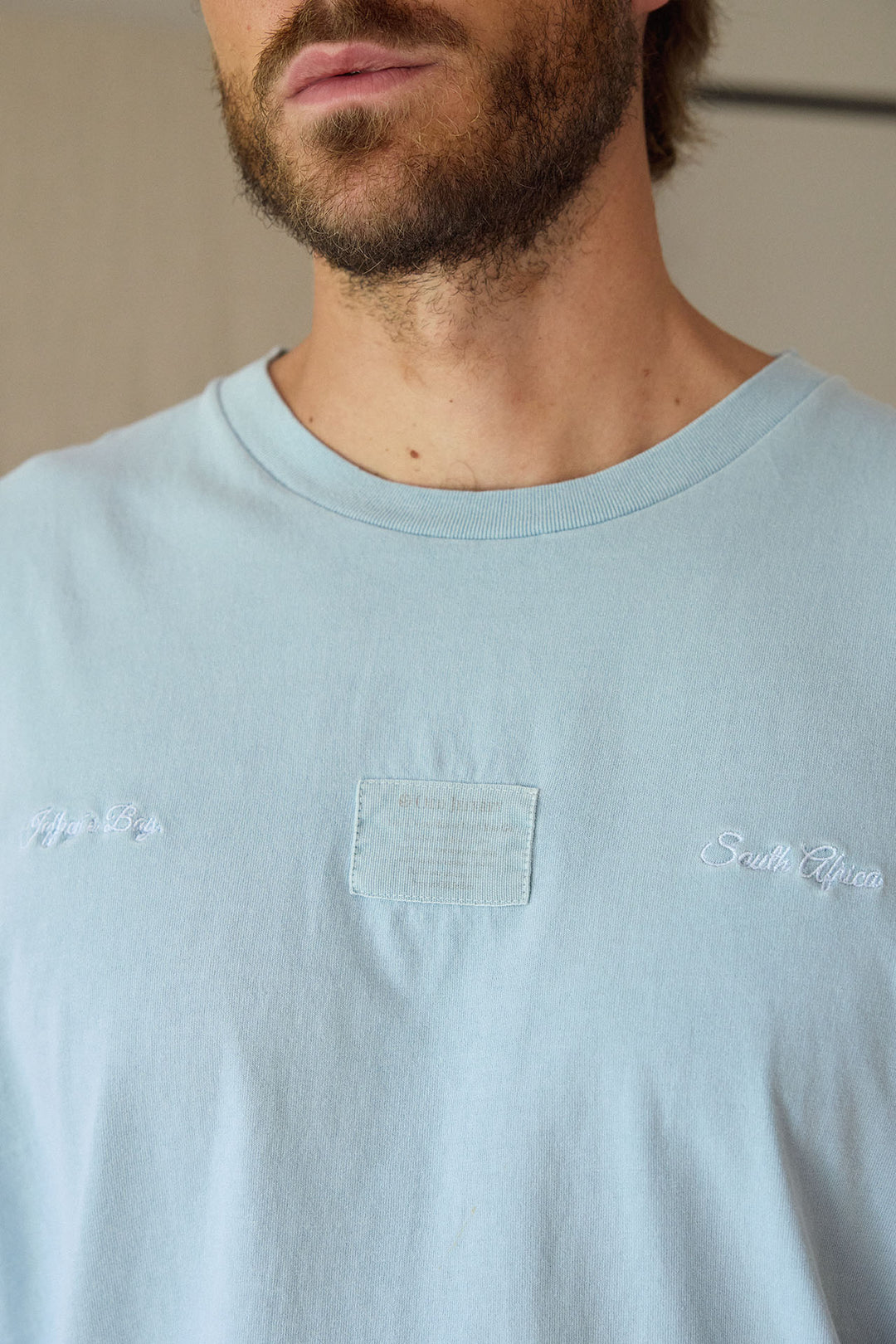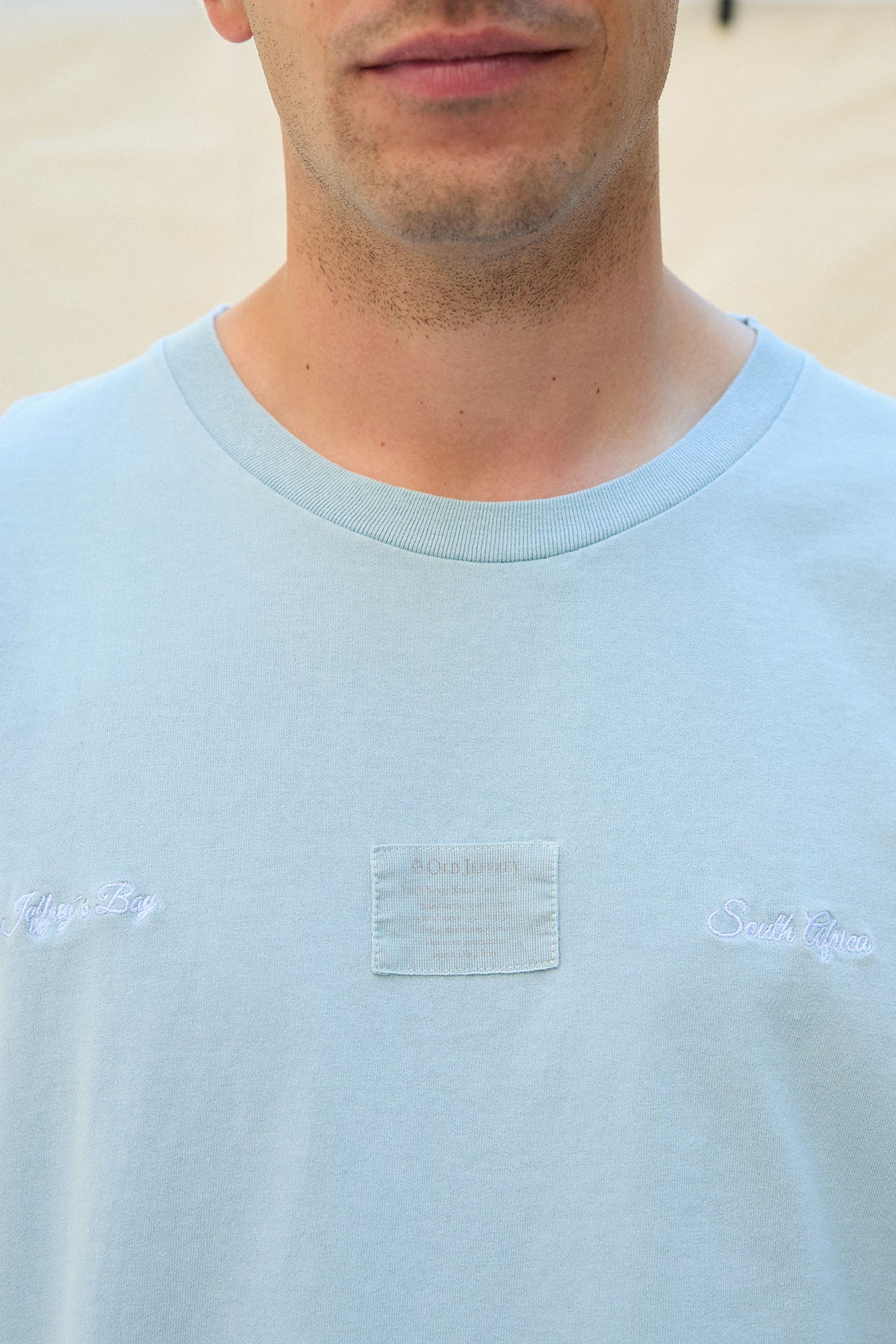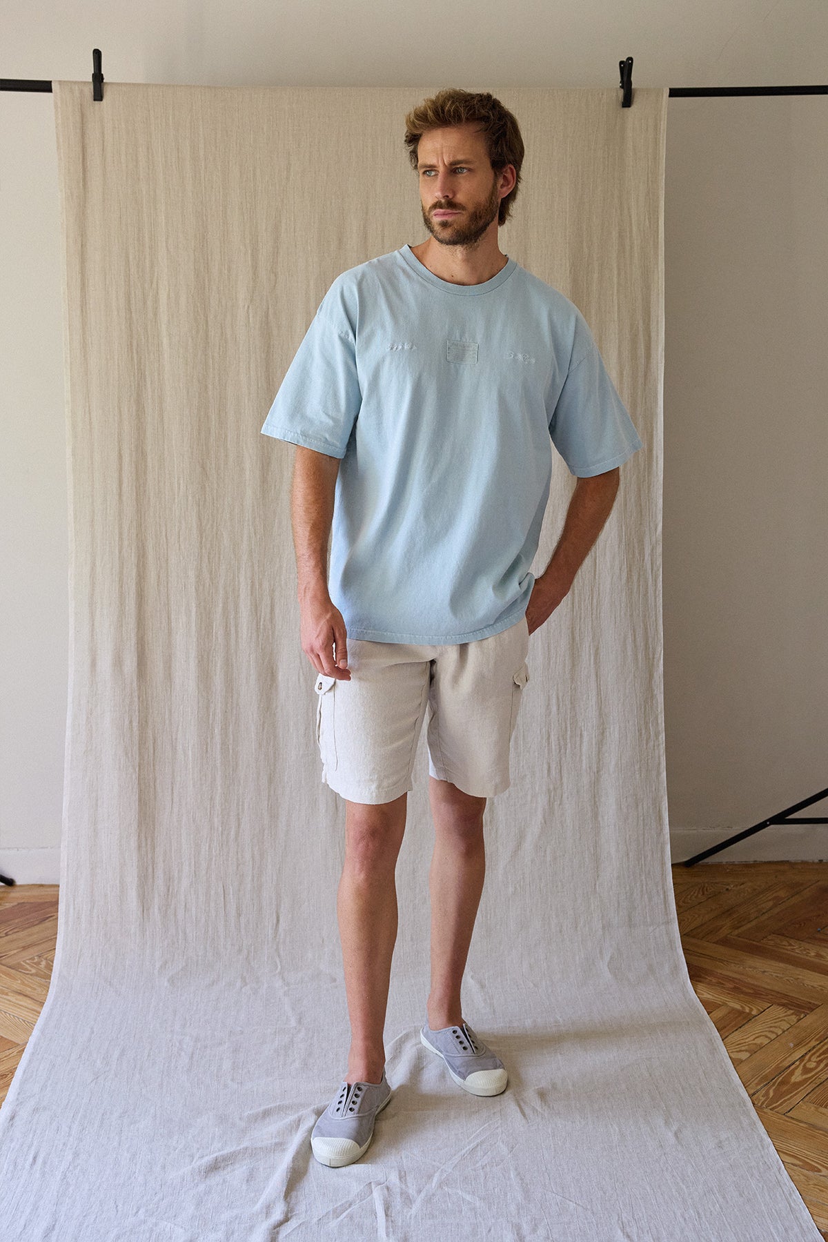 Camiseta confeccionado con 100% algodón orgánico de hilatura open-end de 210 g/m2. Se ha procedido a tintar la prenda en color amarillo napolitano desgastado con tintes naturales y, de manera posterior, se ha sometido a un proceso de lavado que le confiere un aspecto vintage & eighties. Entre sus principales detalles de diseño destacan: