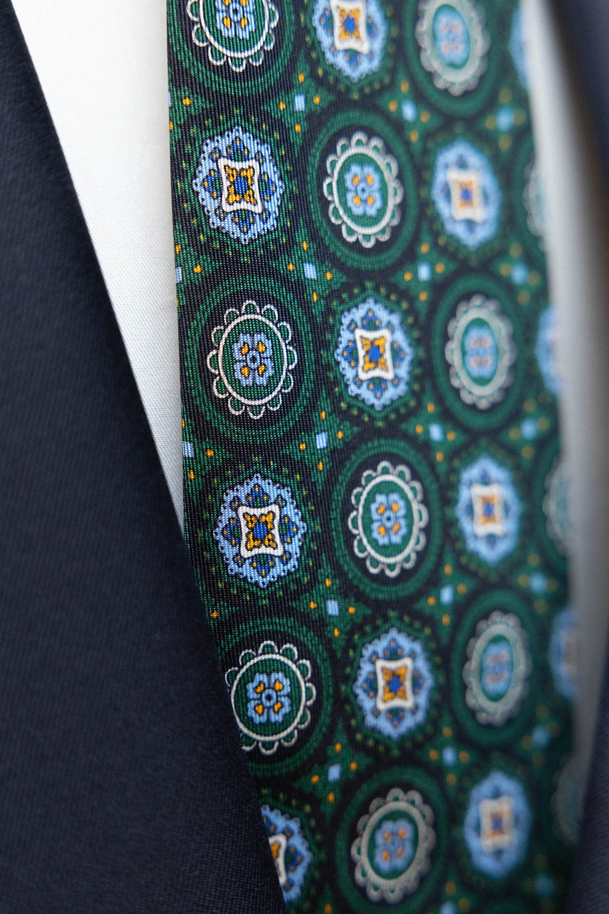 Corbata Napoli Seda Verde Geometria Medallón Azul, Amarillo y Verde