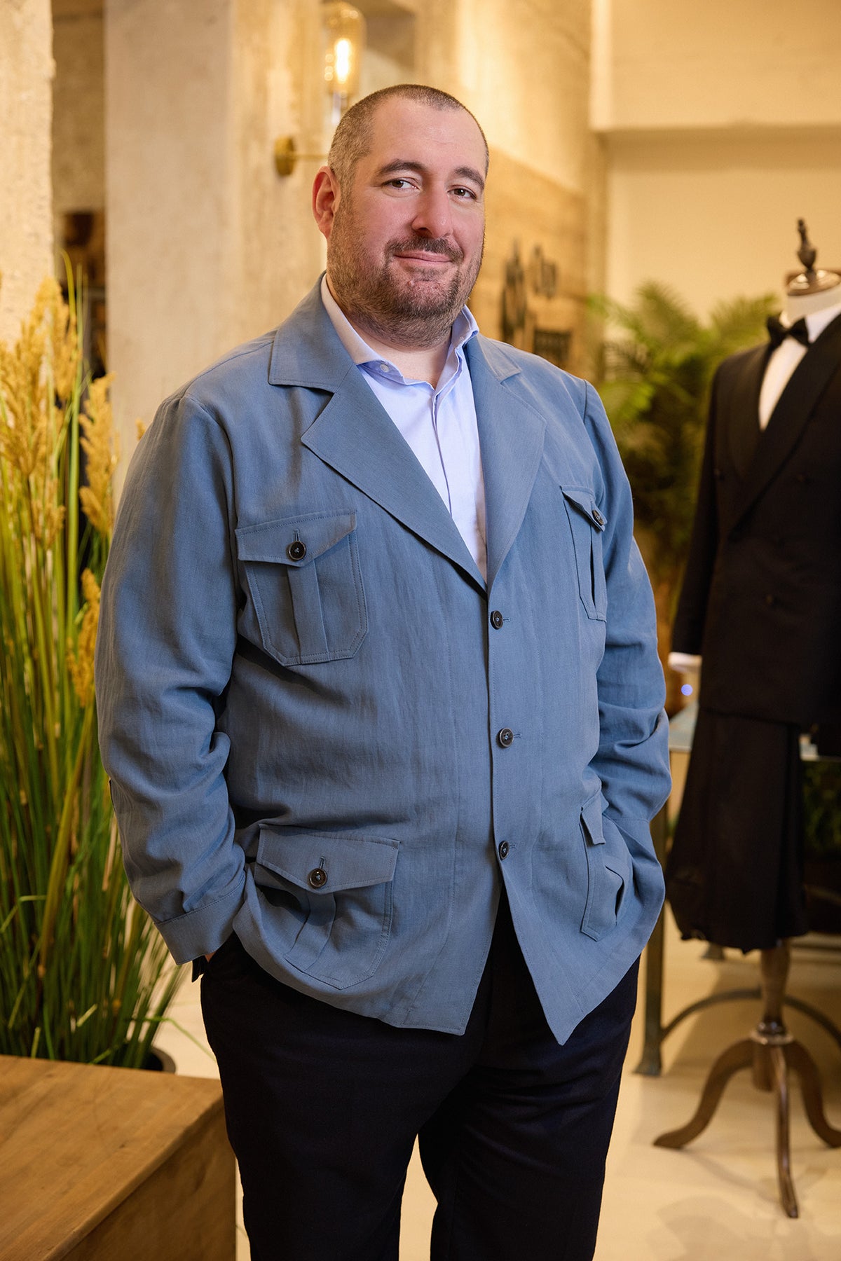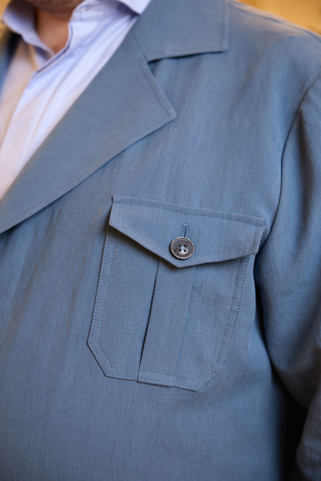 La sahariana perfecta para los días cálidos. Confeccionada en 100% lino Solbiati "Delavé", esta prenda combina frescura y elegancia con un acabado lavado que aporta un carácter relajado y sofisticado. Su diseño de tres botones y solapas anchas realza la estructura clásica, mientras que los cuatro bolsillos de parche con tapeta y botón de nácar añaden funcionalidad y estilo.
