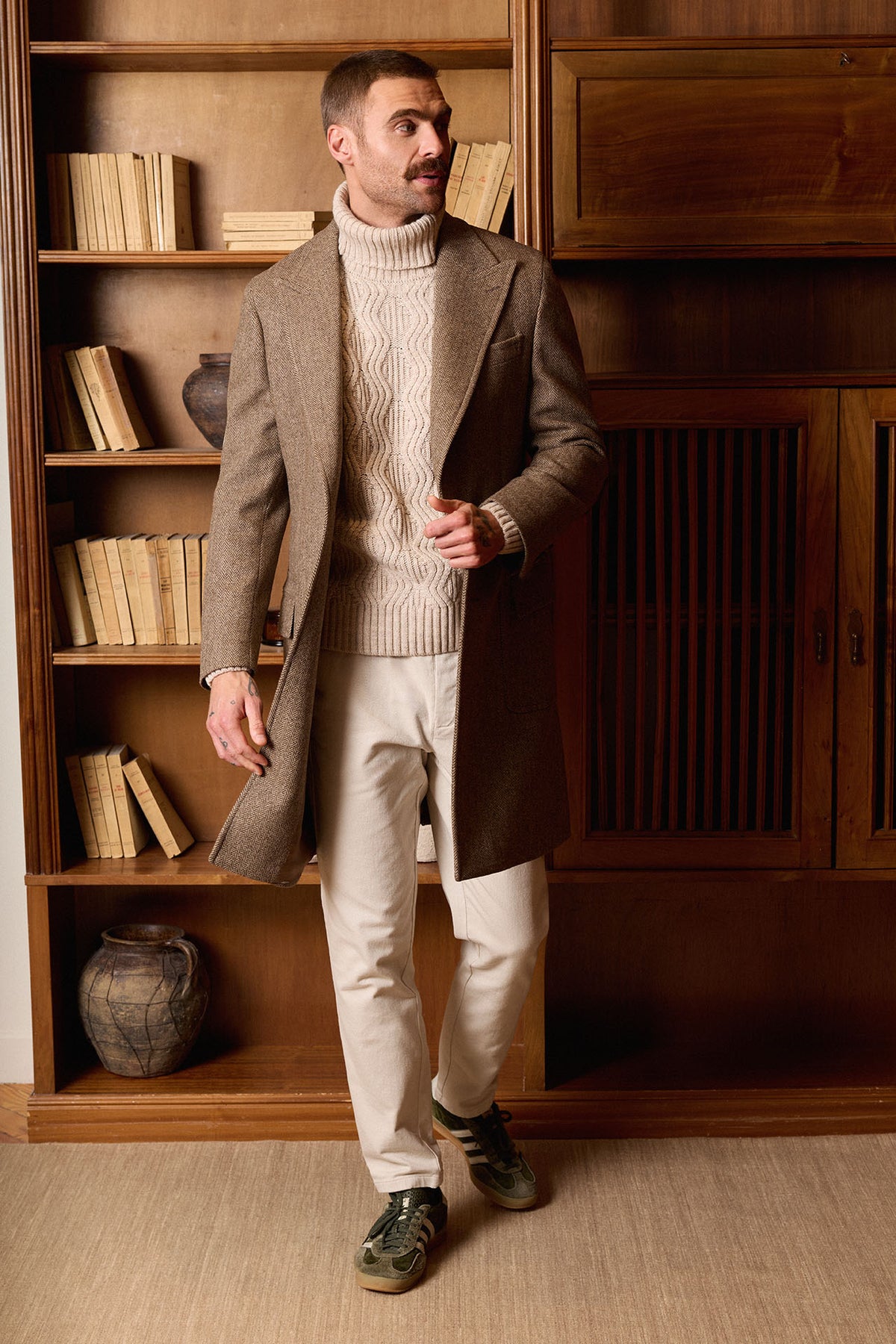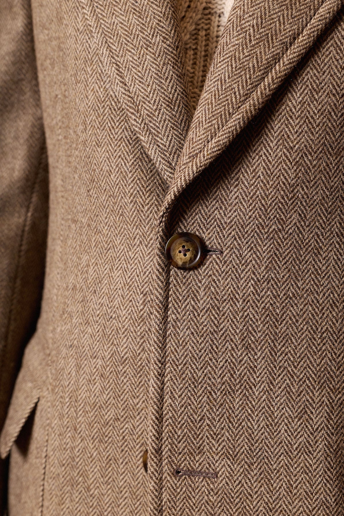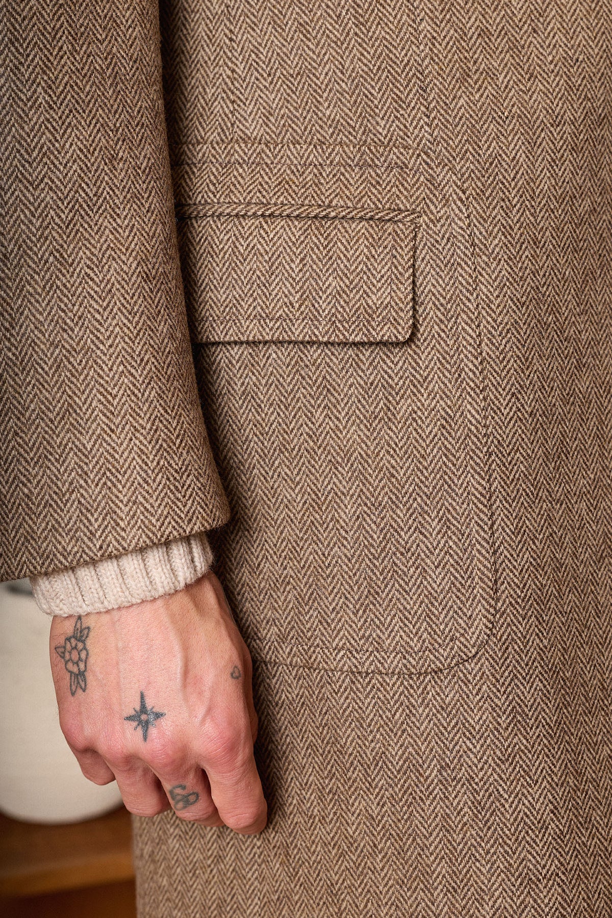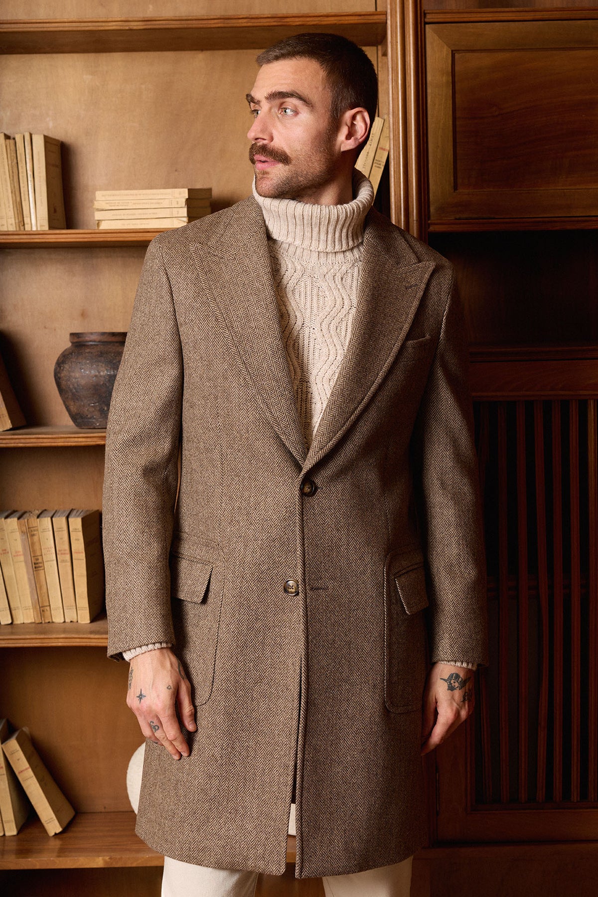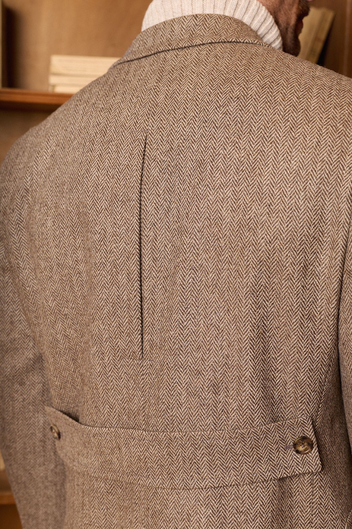 Casaco castanho em espinha de peixe, confecionado em 100% lã em Coimbra, Portugal. Apresenta lapela em bico, martingale traseiro removível, costuras impecáveis ​​e um bolso de remendo com aba. Uma peça quente, elegante e intemporal, perfeita para os meses de outono e inverno.