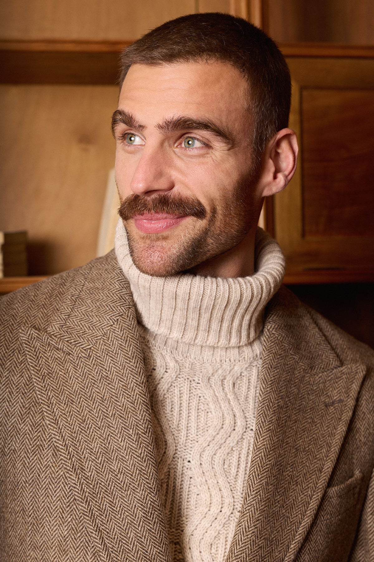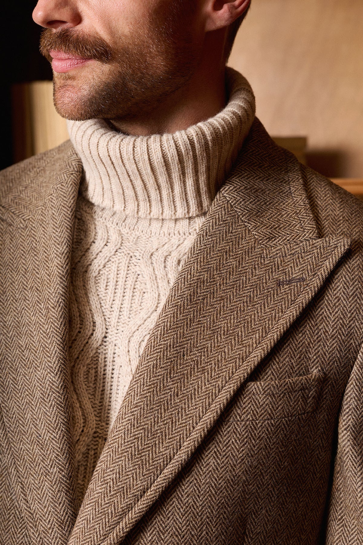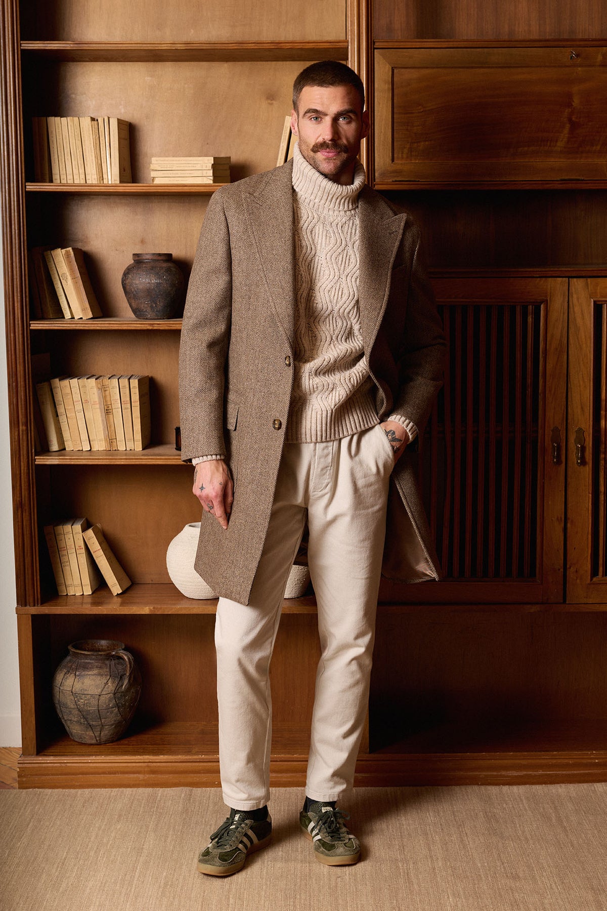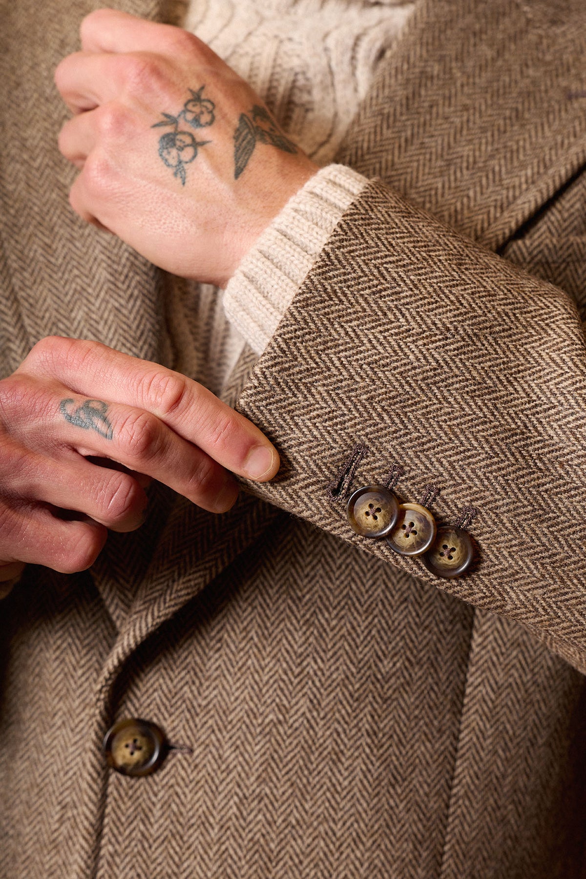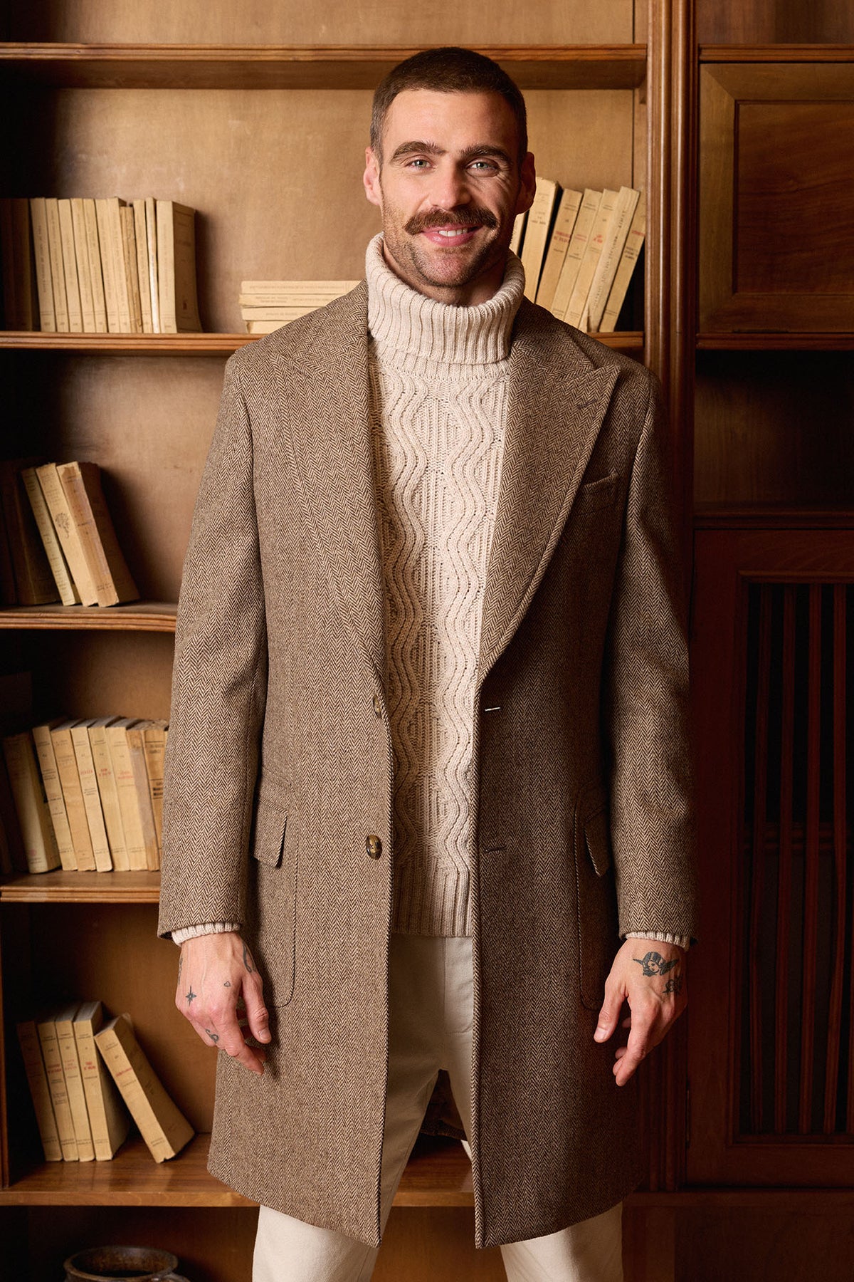 Casaco castanho em espinha de peixe, confecionado em 100% lã em Coimbra, Portugal. Apresenta lapela em bico, martingale traseiro removível, costuras impecáveis ​​e um bolso de remendo com aba. Uma peça quente, elegante e intemporal, perfeita para os meses de outono e inverno.