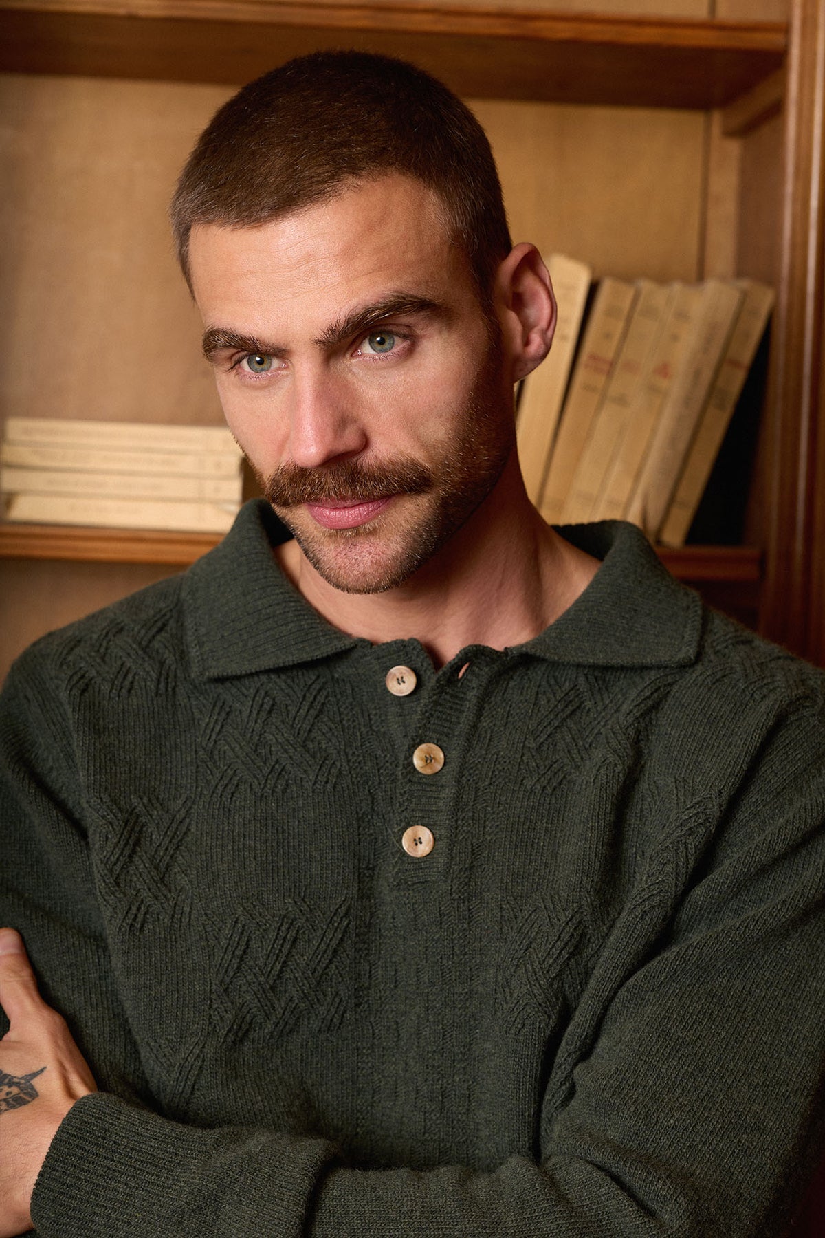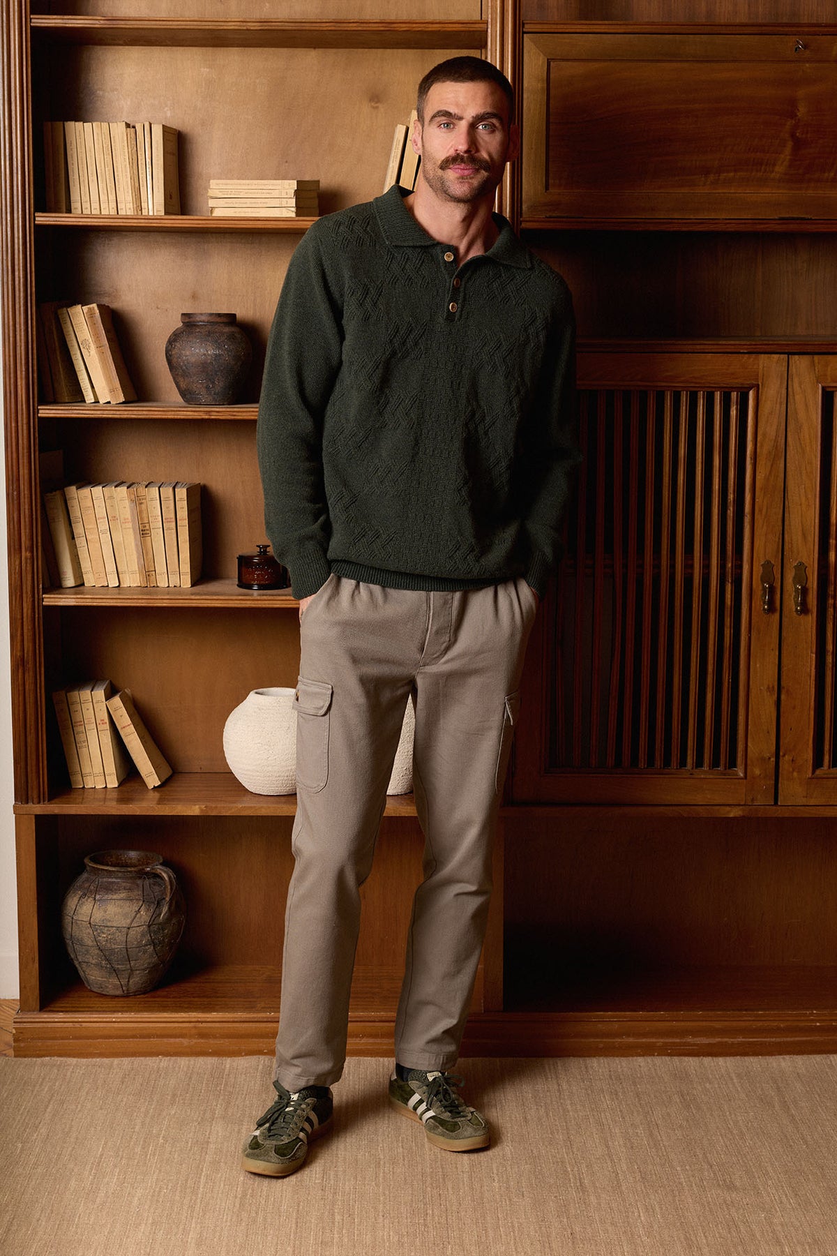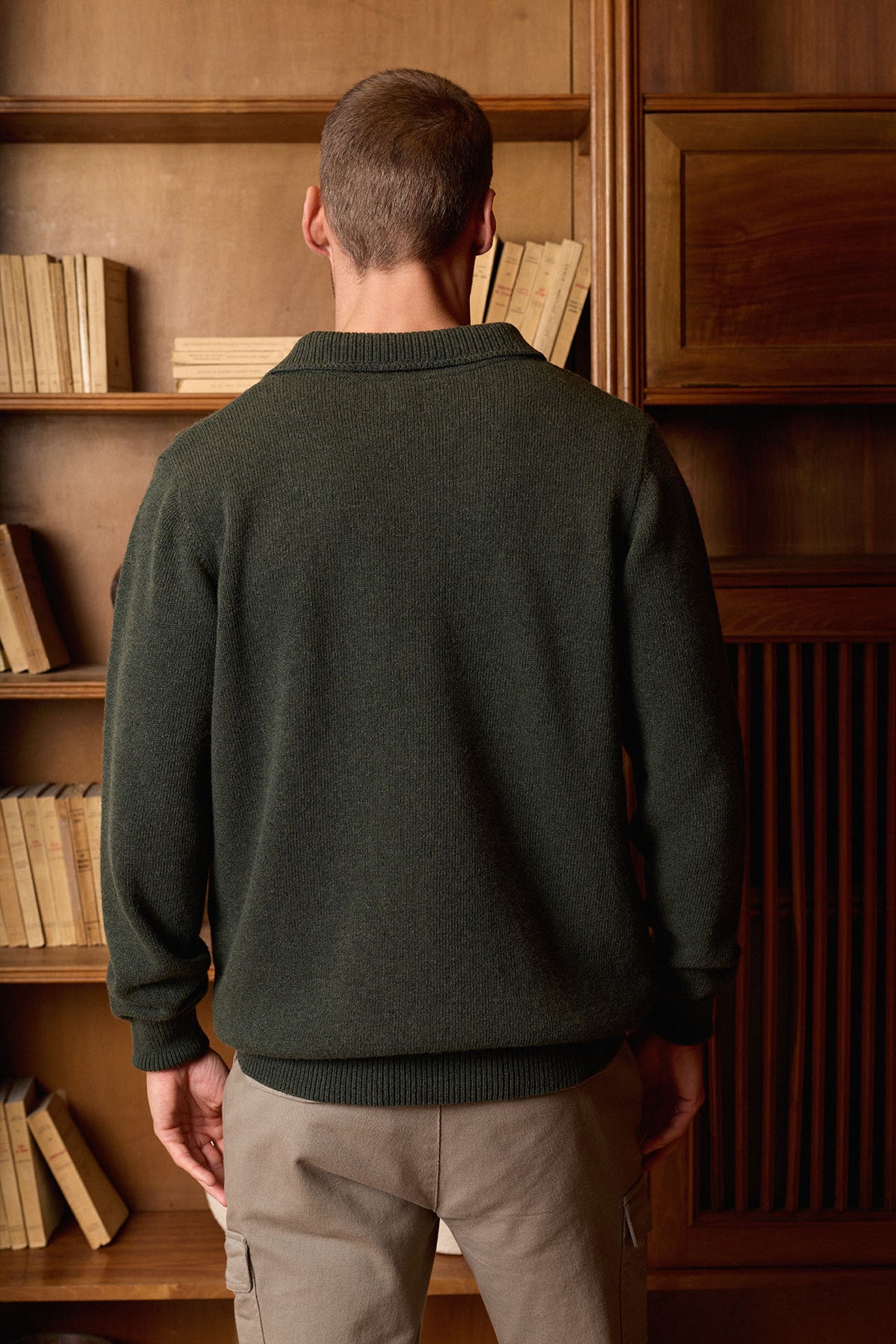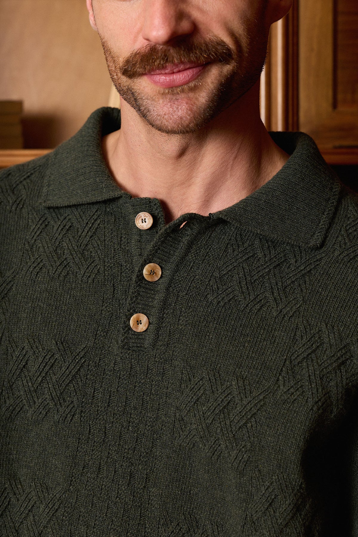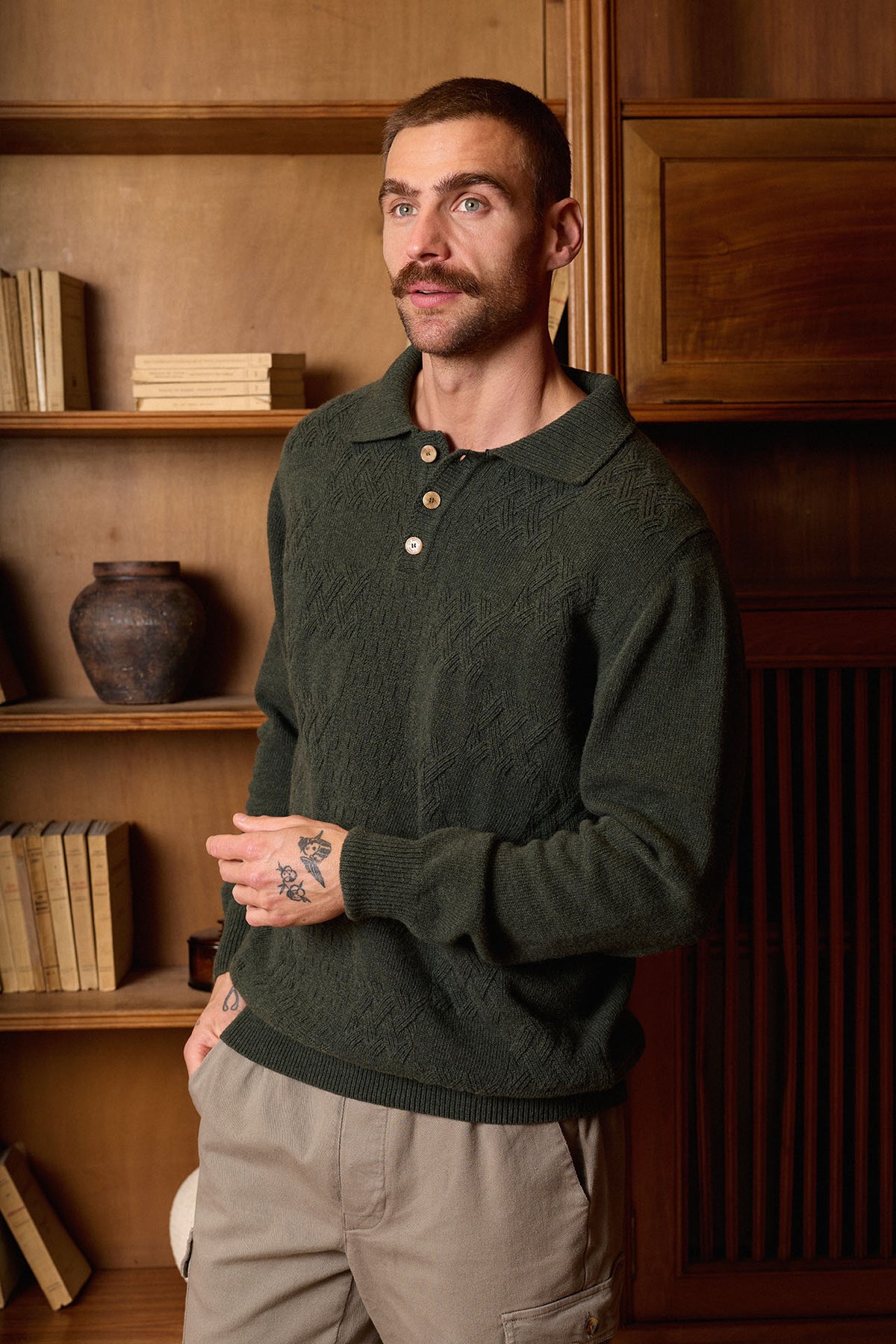 Polo de punto verde caza confeccionado en lana extrafina 100%, con relieve texturizado que aporta profundidad y carácter. Incorpora cuello clásico y botones de cuerno frontales, combinando confort y diseño en una prenda atemporal pensada para un armario actual y versátil.