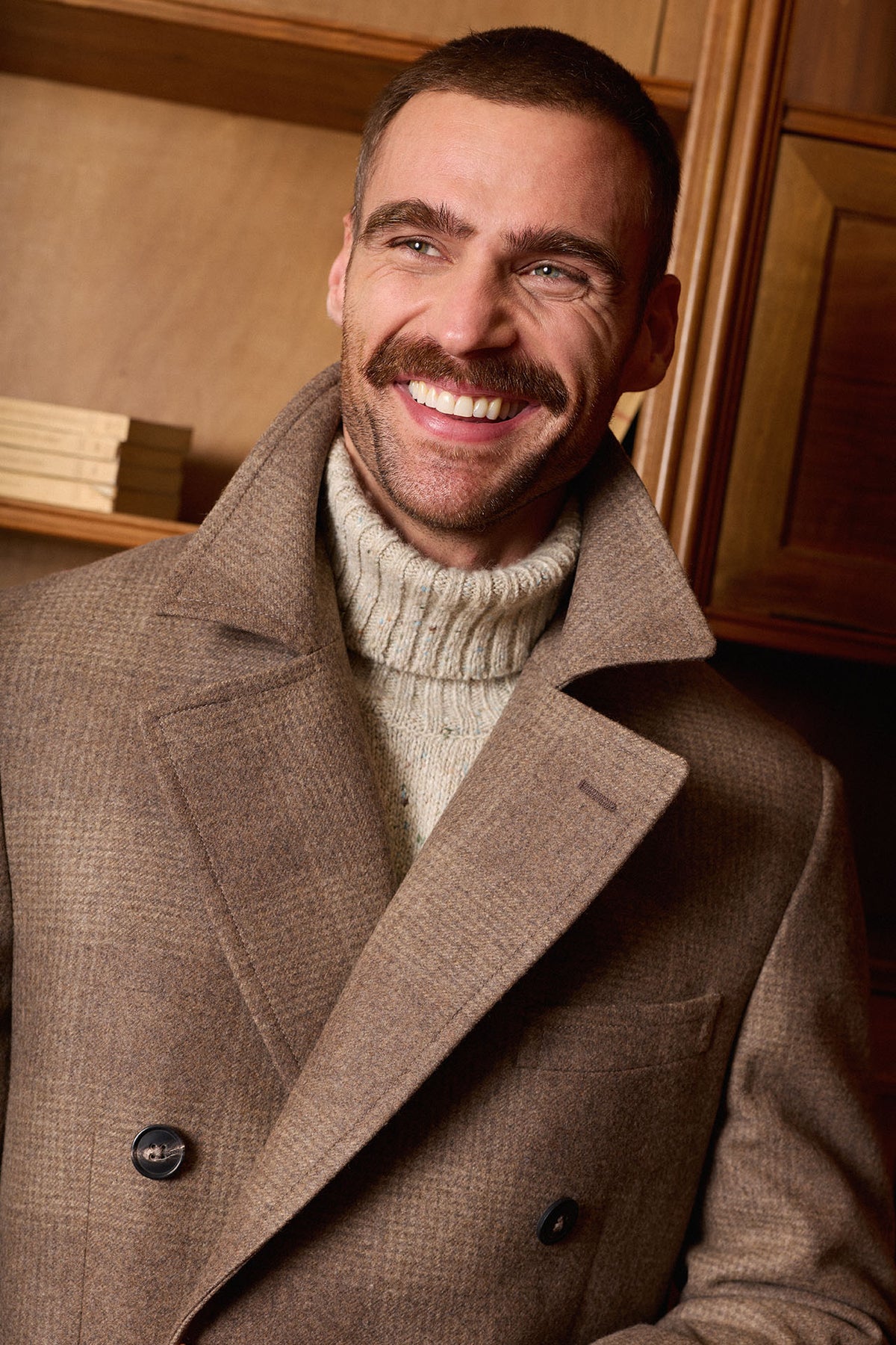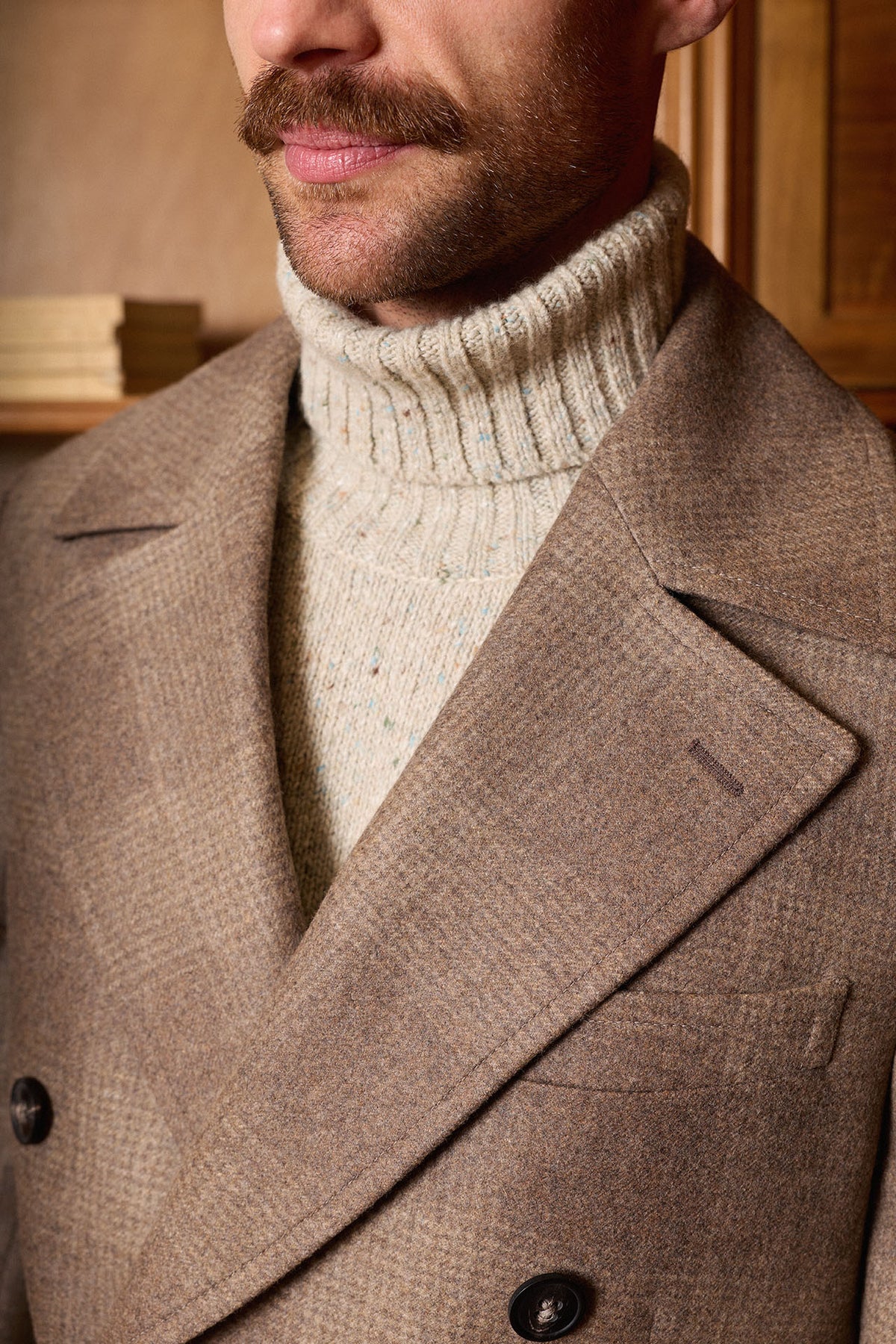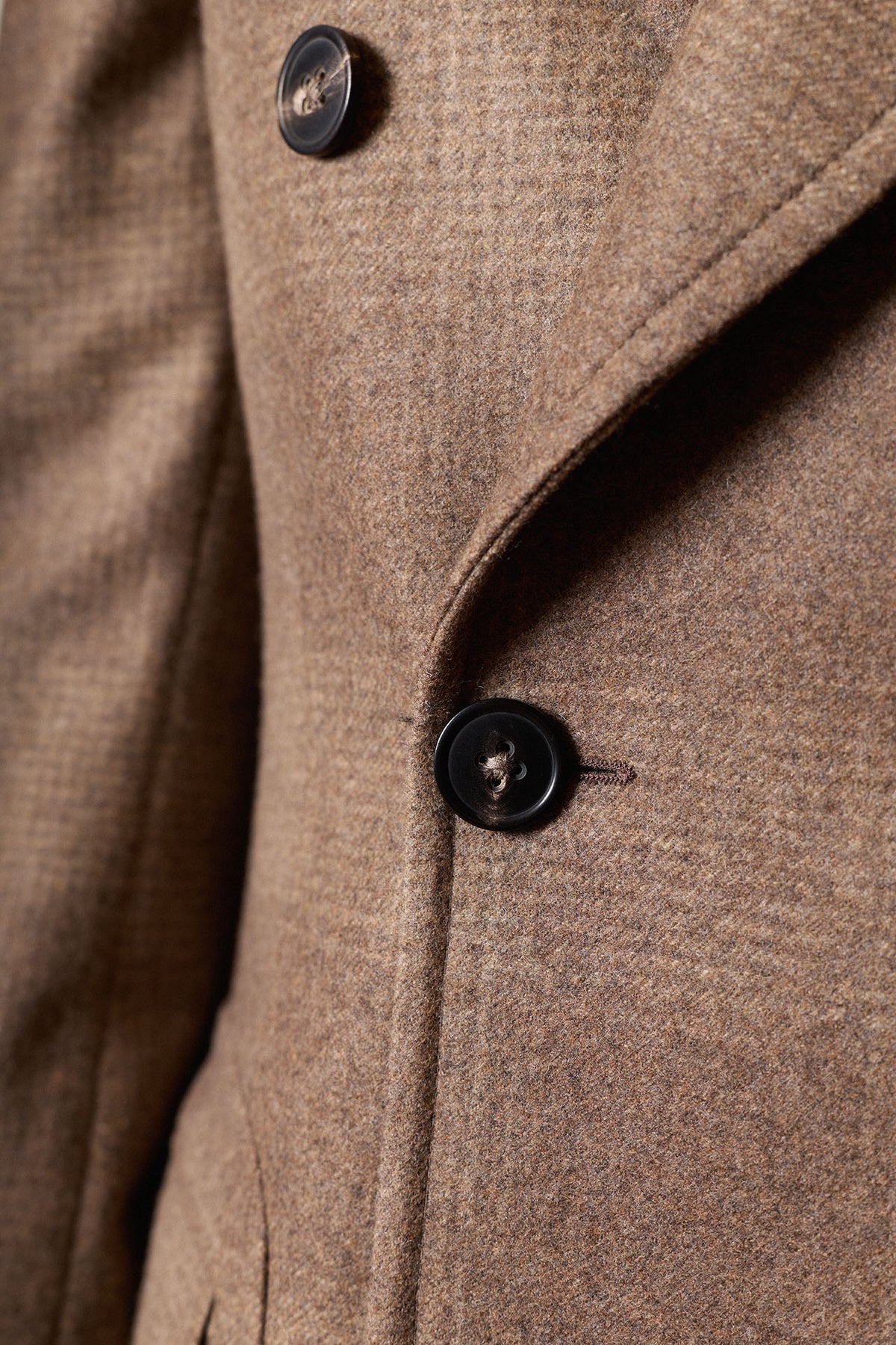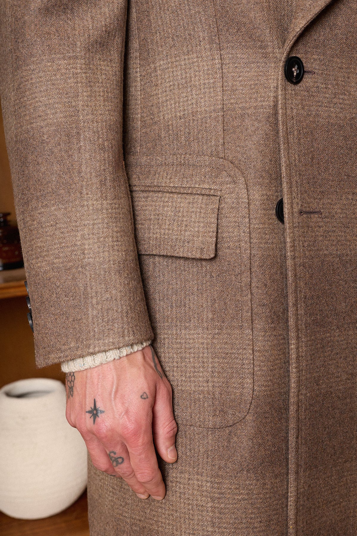 Casaco de abotoamento duplo em padrão Príncipe de Gales bege, confecionado em 100% lã e produzido em Coimbra, Portugal. Apresenta lapelas clássicas de 10 cm, martingale fixo nas costas, abertura traseira com reforço central e bolsos inclinados, incluindo um bolso para bilhetes. Uma peça quente e intemporal, ideal para o outono e inverno.