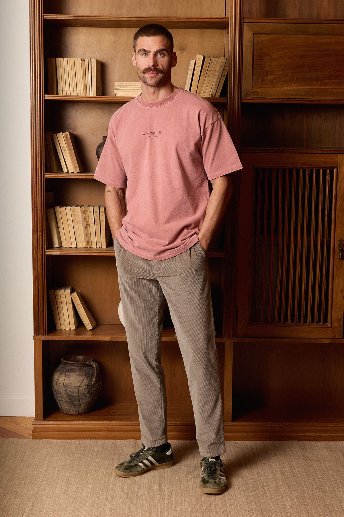 Pantalón chino confeccionado en Guimarães (Portugal) en tejido de pana compuesto por 97% algodón y 3% elastano. Cuenta con cintura elástica con cordón, cierre de botones efecto cuerno, corte Regular-Slim y bolsillos laterales. Disponible en color topo, un básico versátil para cualquier ocasión.