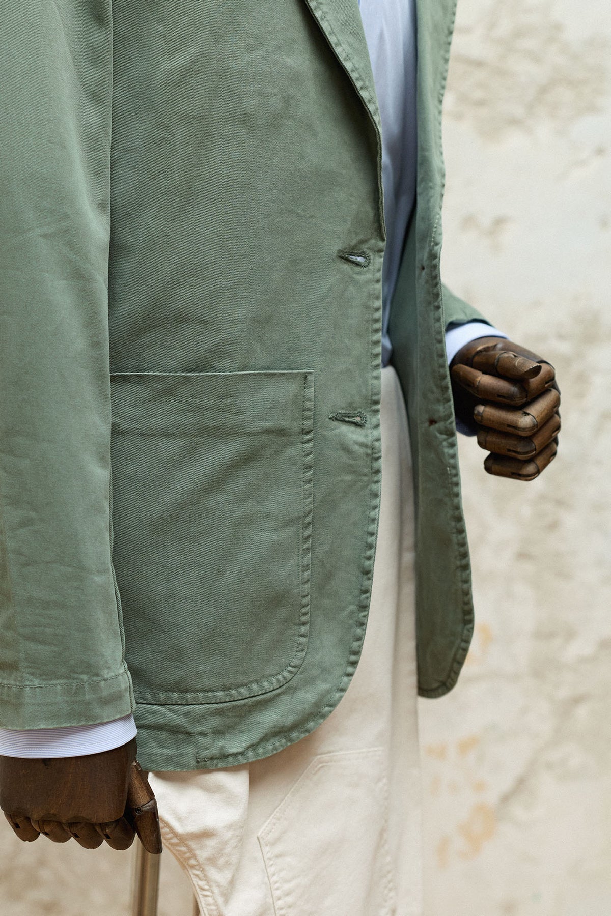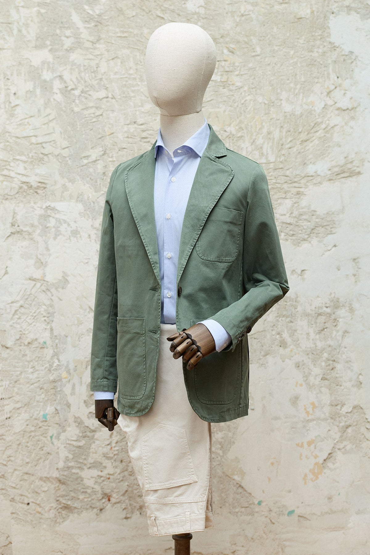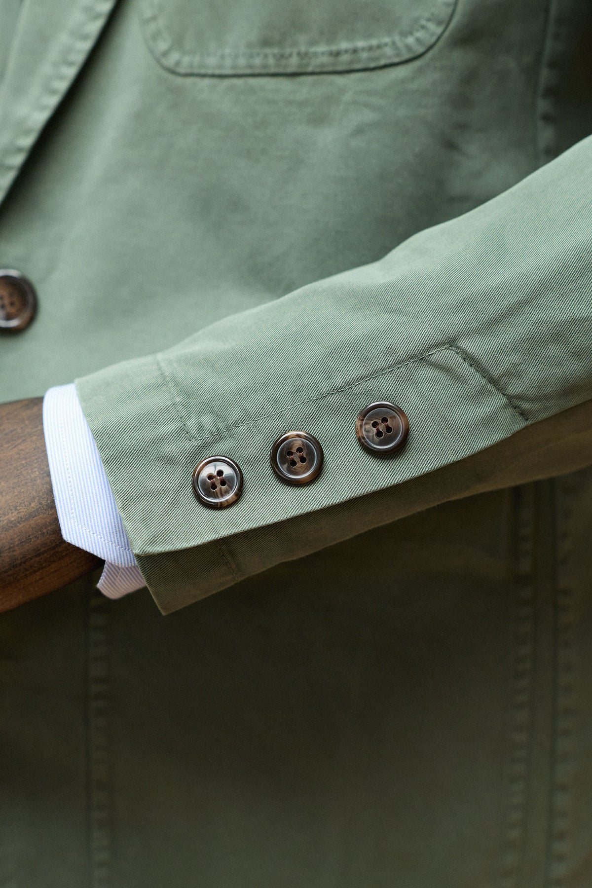 Produzimos nosso blazer na Espanha com tecido 100% algodão tingido em verde-caça com corantes naturais. Os principais detalhes incluem: