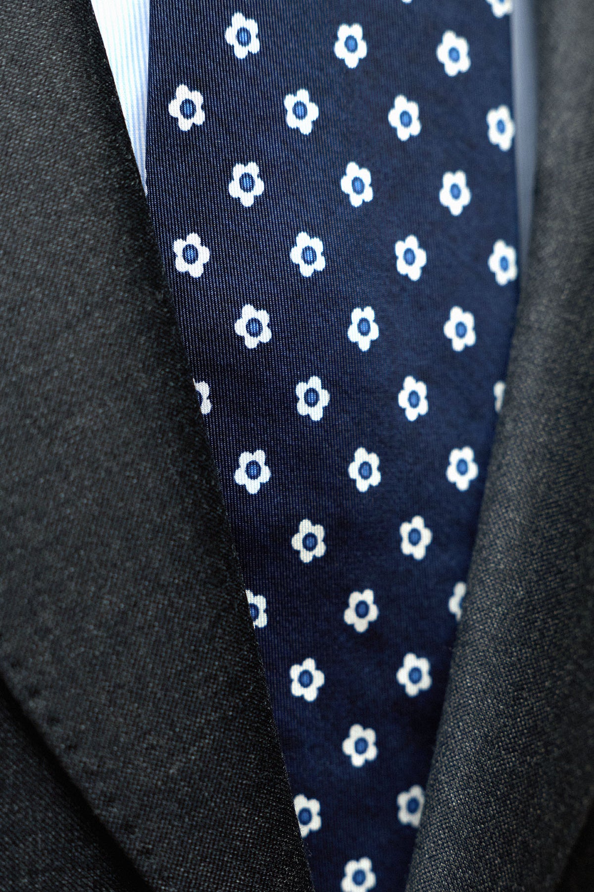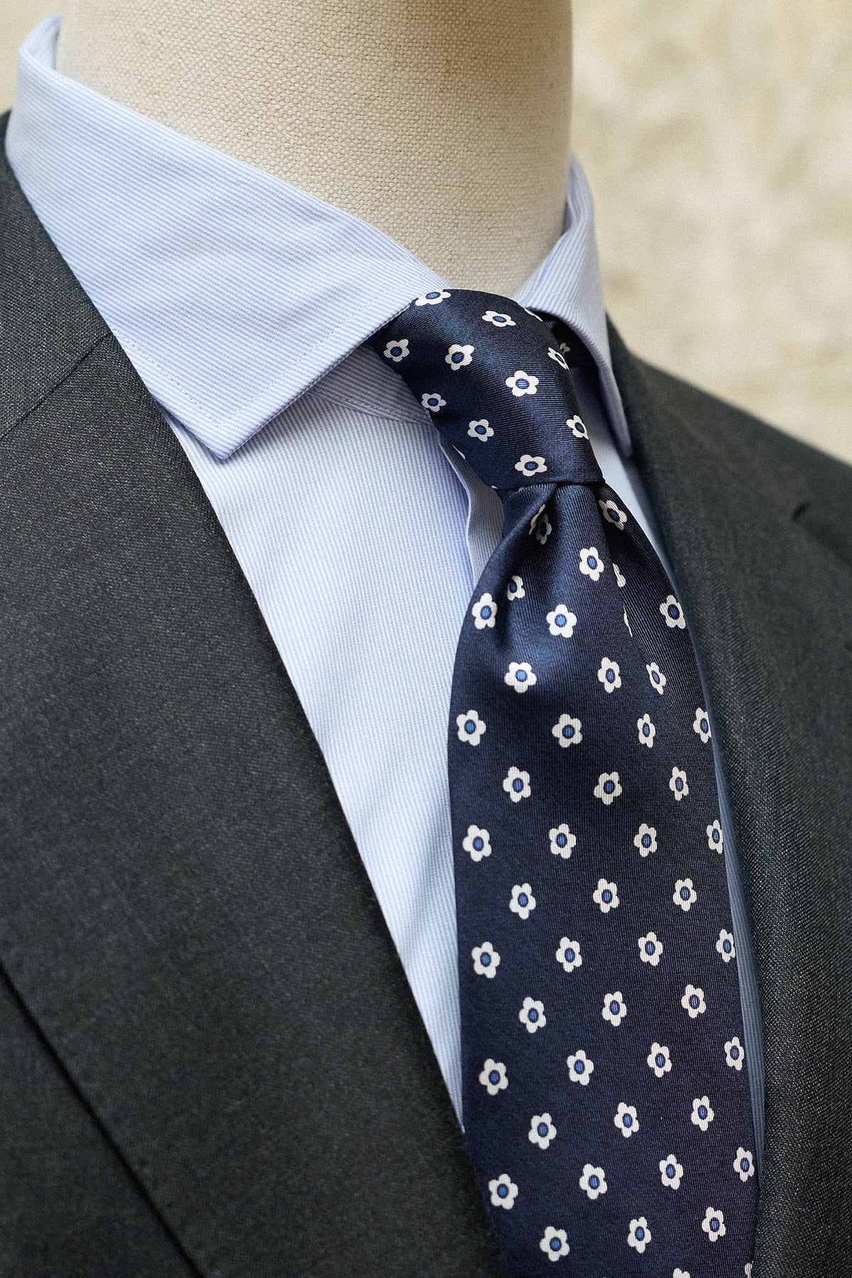 Gravata Napoli Azul Marinho Seda Flores Brancas