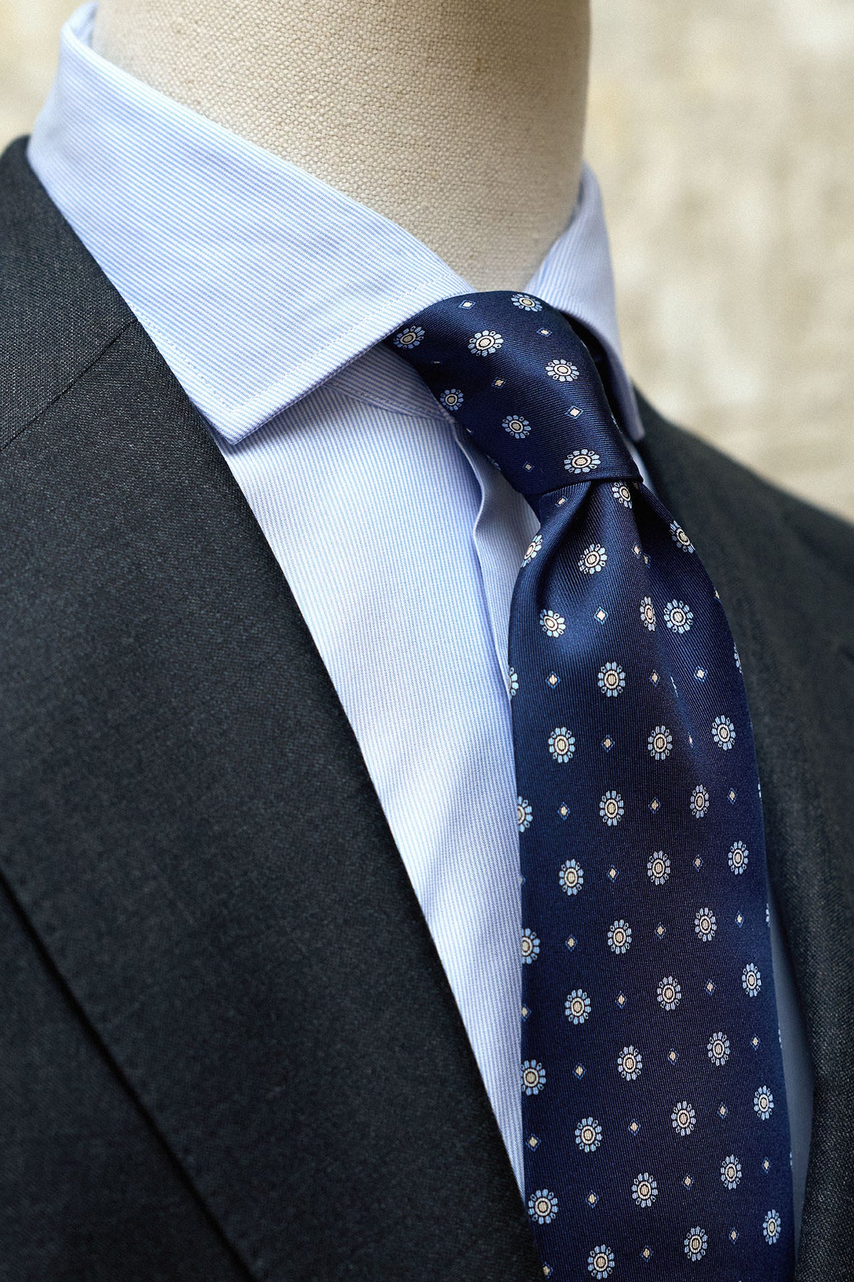 Gravata Napoli em seda azul marinho com medalhão azul e losangos cinzentos.