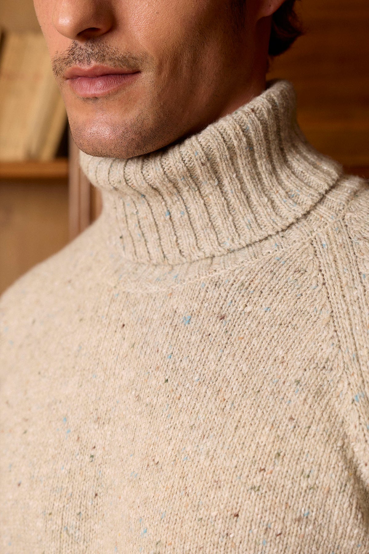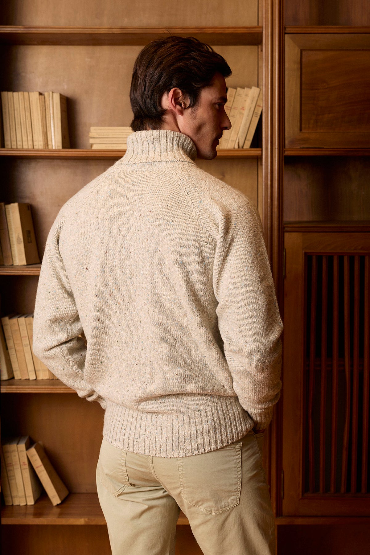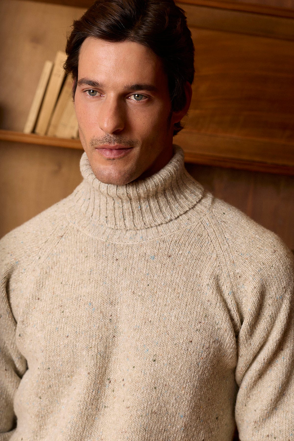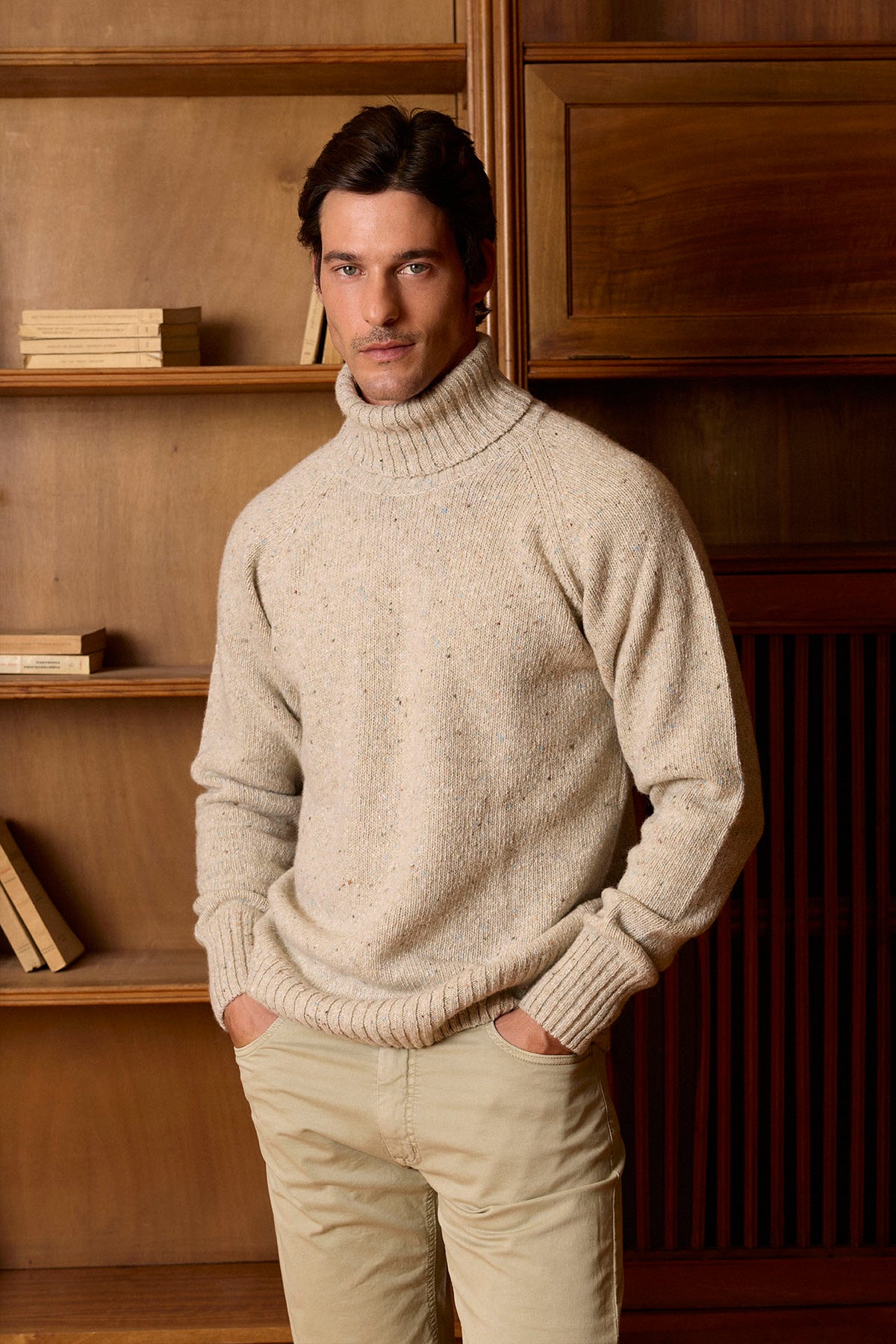 Camisola de gola alta bege terra, confecionada em La Rioja com trama 8 e composição de 60% lã / 20% poliamida / 20% viscose, oferecendo aquecimento, suavidade, resistência e um estilo moderno dos anos oitenta.